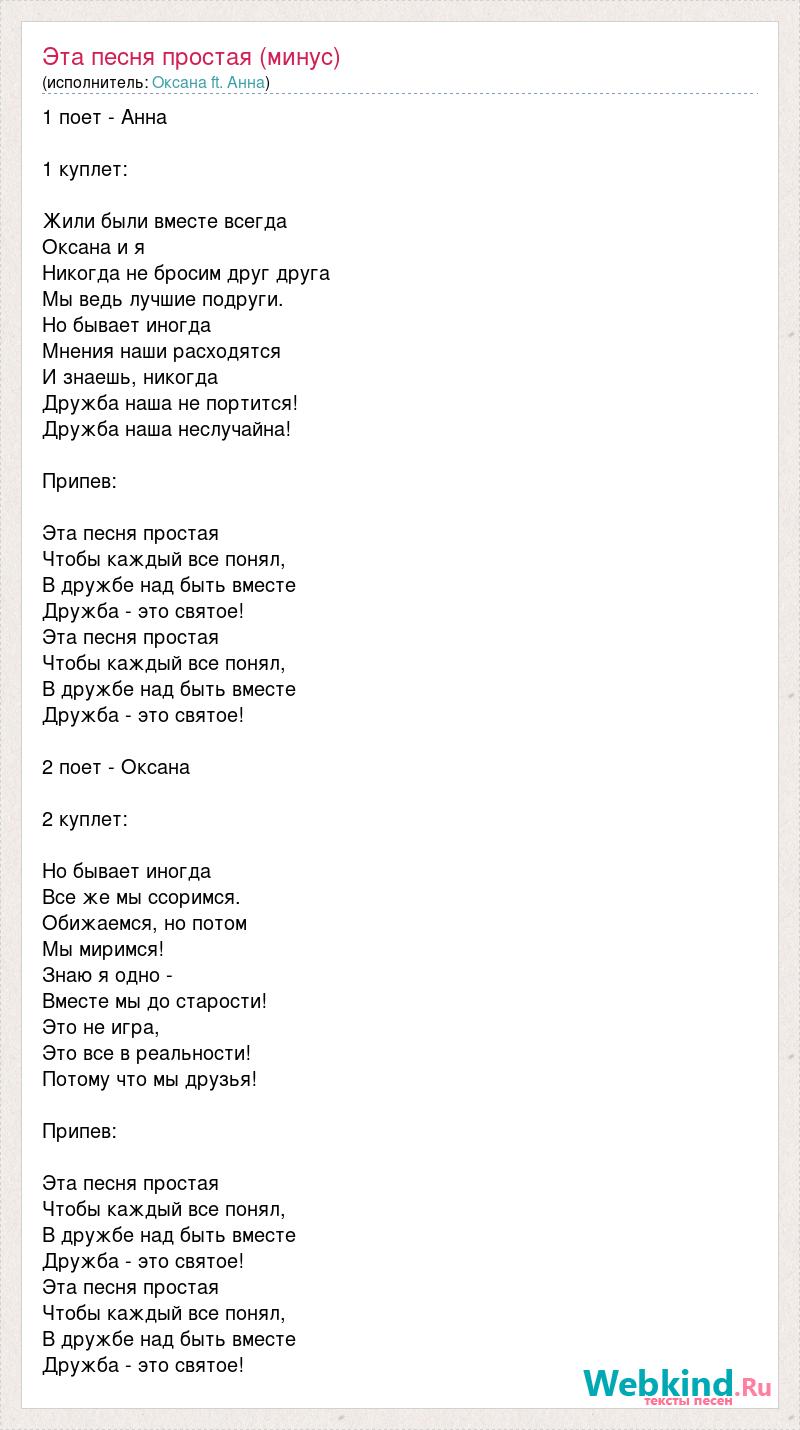 1 поет - Анна 1 куплет: Жили были вместе всегда Оксана и я Никогда не бросим друг друга Мы ведь лучшие подруги. Но бывает иногда Мнения наши расходятся И знаешь, никогда Дружба наша не портится! Дружба наша неслучайна! Припев: Эта песня простая Чтобы каждый все понял, В дружбе над быть вместе Дружба - это святое! Эта песня простая Чтобы каждый все понял, В дружбе над быть вместе Дружба - это святое! 2 поет - Оксана 2 куплет: Но бывает иногда Все же мы ссоримся. Обижаемся, но потом Мы миримся! Знаю я одно - Вместе мы до старости! Это не игра, Это все в реальности! Потому что мы друзья! Припев: Эта песня простая Чтобы каждый все понял, В дружбе над быть вместе Дружба - это святое! Эта песня простая Чтобы каждый все понял, В дружбе над быть вместе Дружба - это святое!