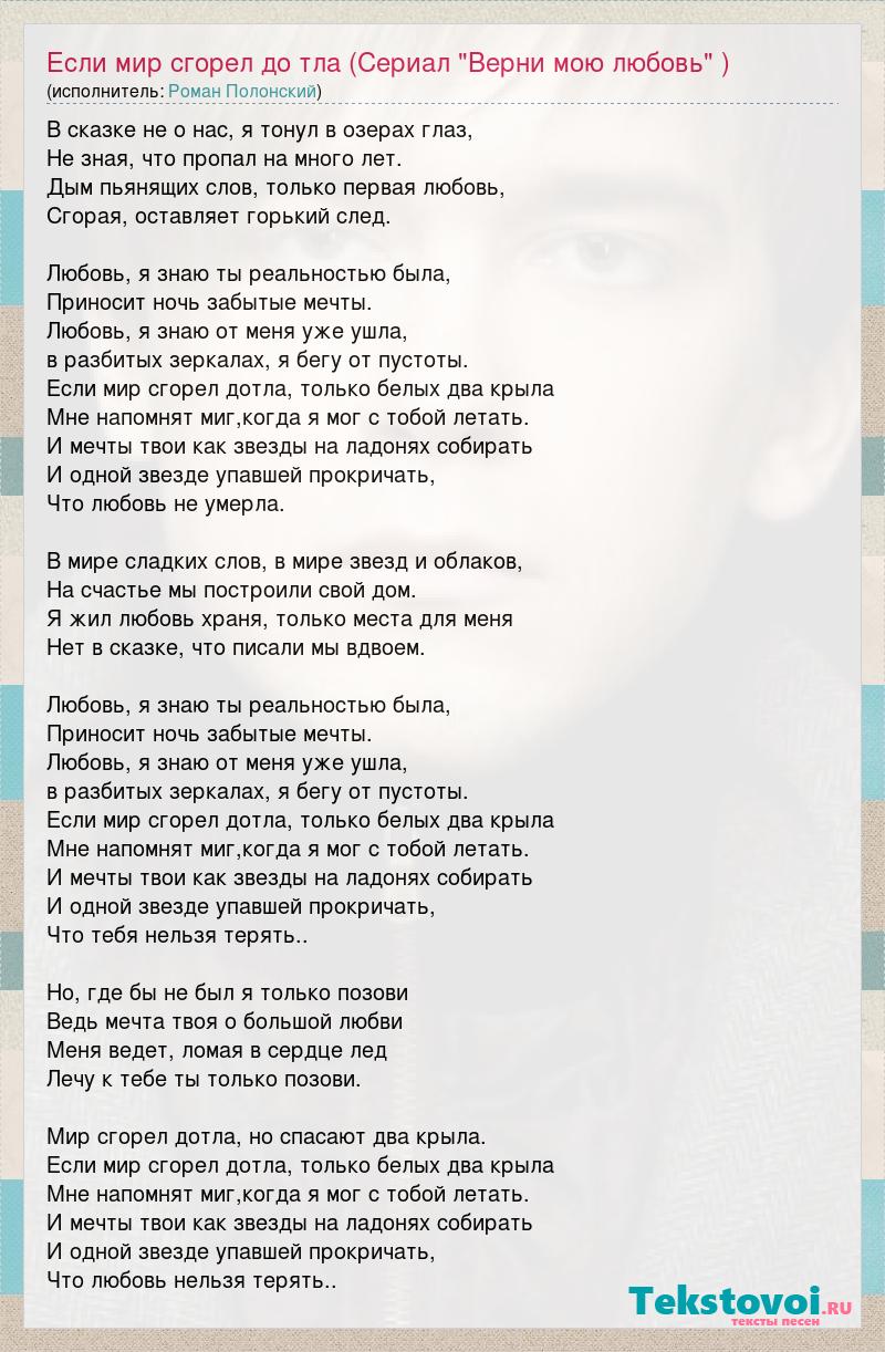 В сказке не о нас, я тонул в озерах глаз, Не зная, что пропал на много лет. Дым пьянящих слов, только первая любовь, Сгорая, оставляет горький след. Любовь, я знаю ты реальностью была, Приносит ночь забытые мечты. Любовь, я знаю от меня уже ушла, в разбитых зеркалах, я бегу от пустоты. Если мир сгорел дотла, только белых два крыла Мне напомнят миг,когда я мог с тобой летать. И мечты твои как звезды на ладонях собирать И одной звезде упавшей прокричать, Что любовь не умерла. В мире сладких слов, в мире звезд и облаков, На счастье мы построили свой дом. Я жил любовь храня, только места для меня Нет в сказке, что писали мы вдвоем. Любовь, я знаю ты реальностью была, Приносит ночь забытые мечты. Любовь, я знаю от меня уже ушла, в разбитых зеркалах, я бегу от пустоты. Если мир сгорел дотла, только белых два крыла Мне напомнят миг,когда я мог с тобой летать. И мечты твои как звезды на ладонях собирать И одной звезде упавшей прокричать, Что тебя нельзя терять.. Но, где бы не был я только позови Ведь мечта твоя о большой любви Меня ведет, ломая в сердце лед Лечу к тебе ты только позови. Мир сгорел дотла, но спасают два крыла. Если мир сгорел дотла, только белых два крыла Мне напомнят миг,когда я мог с тобой летать. И мечты твои как звезды на ладонях собирать И одной звезде упавшей прокричать, Что любовь нельзя терять..