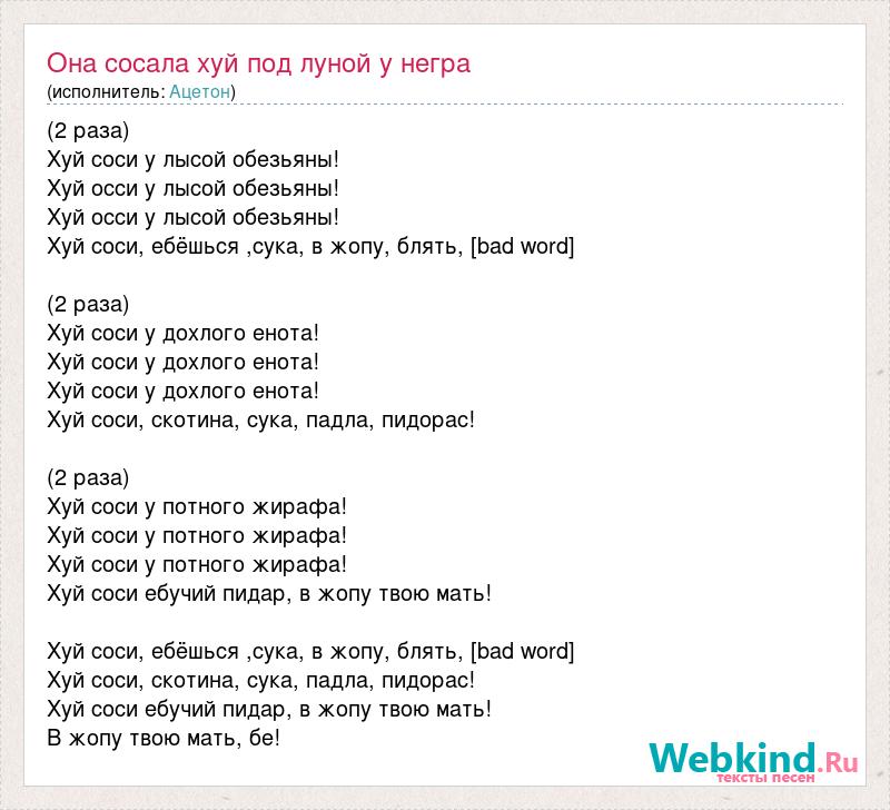 (2 раза) Хуй соси у лысой обезьяны! Хуй осси у лысой обезьяны! Хуй осси у лысой обезьяны! Хуй соси, ебёшься ,сука, в жопу, блять, [bad word] (2 раза) Хуй соси у дохлого енота! Хуй соси у дохлого енота! Хуй соси у дохлого енота! Хуй соси, скотина, сука, падла, пидорас! (2 раза) Хуй соси у потного жирафа! Хуй соси у потного жирафа! Хуй соси у потного жирафа! Хуй соси ебучий пидар, в жопу твою мать! Хуй соси, ебёшься ,сука, в жопу, блять, [bad word] Хуй соси, скотина, сука, падла, пидорас! Хуй соси ебучий пидар, в жопу твою мать! В жопу твою мать, бе!