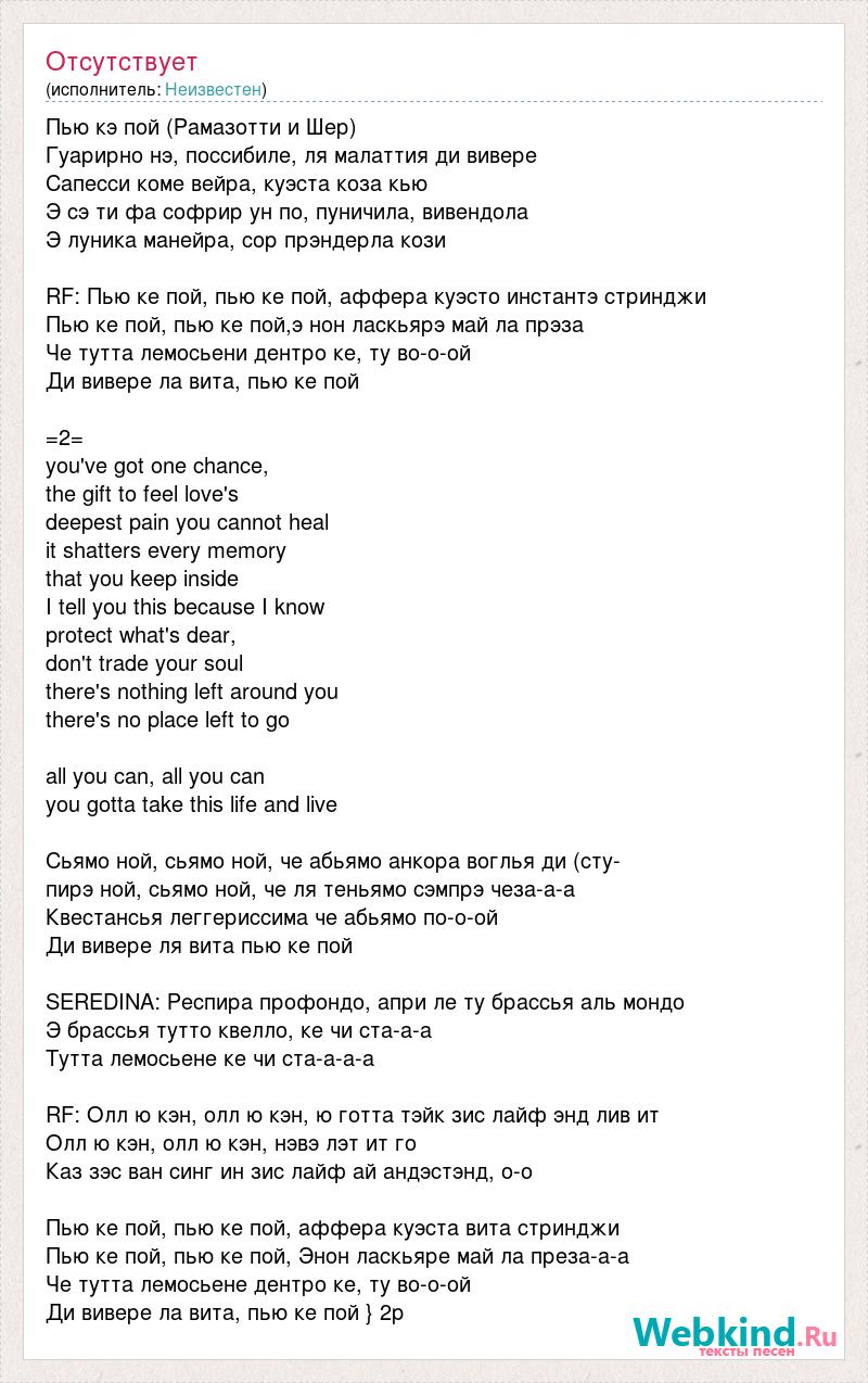 Пью кэ пой (Рамазотти и Шер) Гуарирно нэ, поссибиле, ля малаттия ди вивере Сапесси коме вейра, куэста коза кью Э сэ ти фа софрир ун по, пуничила, вивендола Э луника манейра, сор прэндерла кози RF: Пью ке пой, пью ке пой, аффера куэсто инстантэ стринджи Пью ке пой, пью ке пой,э нон ласкьярэ май ла прэза Че тутта лемосьени дентро ке, ту во-о-ой Ди вивере ла вита, пью ке пой =2= you've got one chance, the gift to feel love's deepest pain you cannot heal it shatters every memory that you keep inside I tell you this because I know protect what's dear, don't trade your soul there's nothing left around you there's no place left to go all you can, all you can you gotta take this life and live Сьямо ной, сьямо ной, че абьямо анкора воглья ди (сту- пирэ ной, сьямо ной, че ля теньямо сэмпрэ чеза-а-а Квестансья леггериссима че абьямо по-о-ой Ди вивере ля вита пью ке пой SEREDINA: Респира профондо, апри ле ту брассья аль мондо Э брассья тутто квелло, ке чи ста-а-а Тутта лемосьене ке чи ста-а-а-а RF: Олл ю кэн, олл ю кэн, ю готта тэйк зис лайф энд лив ит Олл ю кэн, олл ю кэн, нэвэ лэт ит го Каз зэс ван синг ин зис лайф ай андэстэнд, о-о Пью ке пой, пью ке пой, аффера куэста вита стринджи Пью ке пой, пью ке пой, Энон ласкьяре май ла преза-а-а Че тутта лемосьене дентро ке, ту во-о-ой Ди вивере ла вита, пью ке пой } 2р