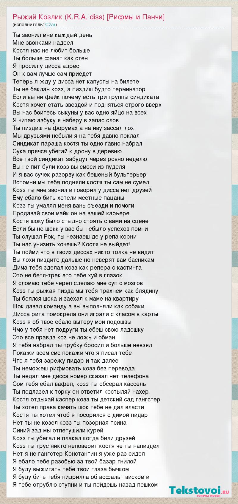 Ты звонил мне каждый день Мне звонками надоел Костя нас не любит больше Ты больше фанат как стен Я просил у дисса адрес Он к вам лучше сам приедет Теперь я жду у дисса нет капусты на билете Ты не баклан козз, а пиздиш будто терминатор Если вы ни фейк почему есть три группы синдиката Костя хочет стать звездой и подняться строго вверх Вы нас боитесь сыкуны у вас одно яйцо на всех Я читаю азбуку я наберу в запас слов Ты пиздиш на форумах а на иву зассал лох Мы друзьями небыли я на тебя давно поклал Синдикат параша костя ты одно гавно набрал Сука прячся убегай к дрону в деревню Все твой синдикат забудут через ровно неделю Вы не пит-були козз вы смеси из пуделя И я вас сучек разорву как бешеный бультерьер Вспомни мы тебя подняли костя ты сам не сумел Козз ты мне звонил и говорил у дисса нет друзей Ему ебало бить хотели местные пацаны Козз ты умалял меня вань съезди и помоги Продавай свои майк он на вашей карьере Костя шоку было стыдно стоять с вами на сцене Если бы не шокк у вас бы небыло успехов помни Ты слушал Рок, ты незнаеш де у репа корни Ты нас унизить хочешь? Костя не выйдет! Ты пойми что в твоих диссах никто толка не видит Вы лохи пиздите дальше но неверят вам басникам Дима тебя зделал козз как репера с кастинга Это не бетл-трек это тебе хуй в глазок Я сломаю тебе череп сделаю мне суп с мозгов Козз ты рыжая пизда мы тебя трахнем как блядину Ты боялся шока и заехал к маме на квартиру Шок давал команду а вы выполняли как собаки Дисса рита помокрела они играли с класом в карты Козз я об твое ебало вытеру мои подошвы Чмо у тебя нет подруги ты ебеш свою ладошку Это все правда коз не ложь и обман Я тебя набрал ты трубку бросил и больше невзял Покажи всем смс покажи что я писал тебе Что я тебя зарежу пидар и так далее Ты неможеш рифмовать козз без перевода Ты недал мне дисса номер сказал нет телефона Сом тебя ебал вафел, козз ты обсерал кассель Ты подлазел к торку он ответил костыляй нахер Костя отдыхай каспер козз ты детский сад гангстер Ты хотел права качать шок тебе не дал власти Костя ты хотел чтоб я посорился с димой пидар Нет ты не козел козз ты позорная псина Синий зад мы отпетушили курей Козз ты убегал и плакал когда били друзей Козз ты трус никто неповерит костя че ты напиздел Нет я не гангстер Константин я уже раз сидел Я ебало тебе разобью за твой базар гнилой Я буду выжигать тебе твои глаза бычком Я буду бить тебя пидрилла об асфальт виском и Я тебе отрублю ступни и ты пойдешь назад пешком