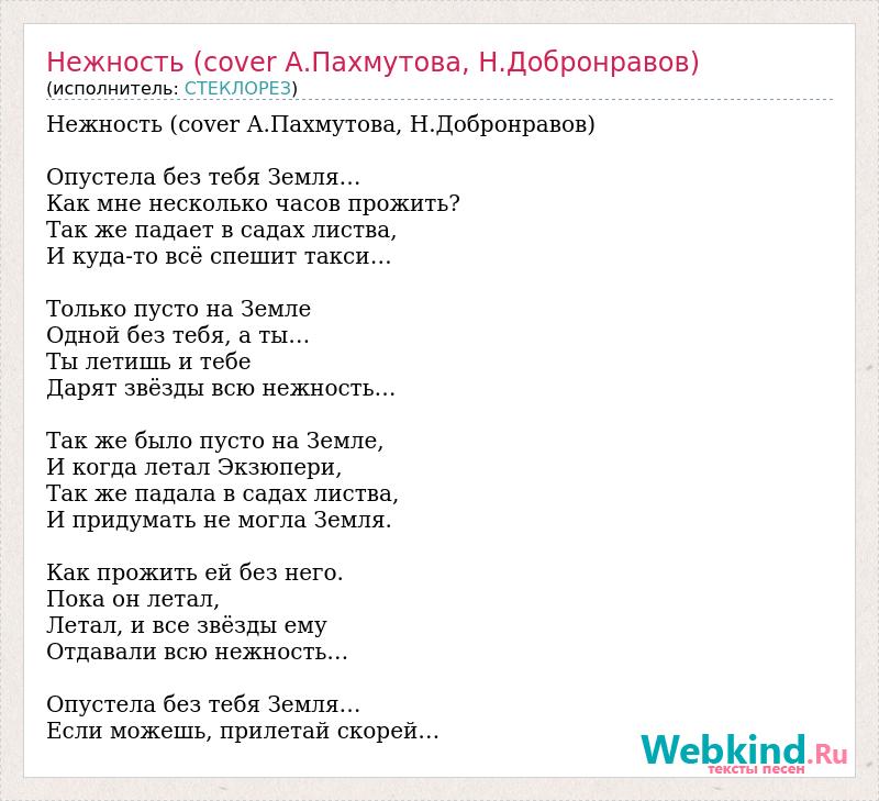 Нежность (cover А.Пахмутова, Н.Добронравов) Опустела без тебя Земля… Как мне несколько часов прожить? Так же падает в садах листва, И куда-то всё спешит такси… Только пусто на Земле Одной без тебя, а ты… Ты летишь и тебе Дарят звёзды всю нежность… Так же было пусто на Земле, И когда летал Экзюпери, Так же падала в садах листва, И придумать не могла Земля. Как прожить ей без него. Пока он летал, Летал, и все звёзды ему Отдавали всю нежность… Опустела без тебя Земля… Если можешь, прилетай скорей…