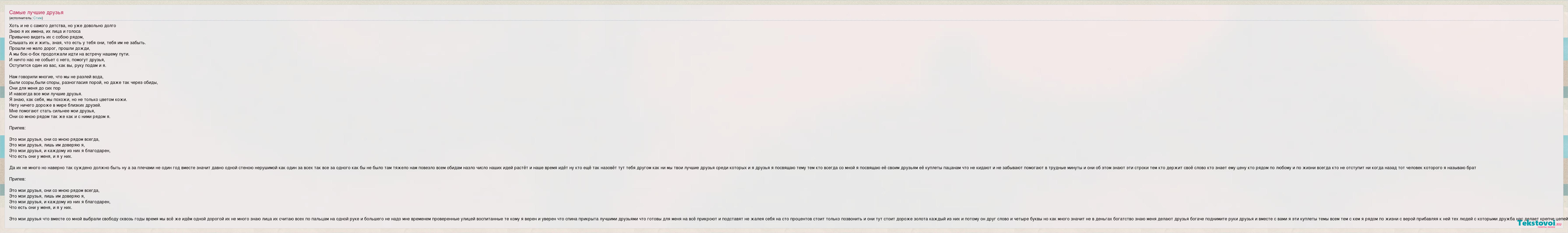 Хоть и не с самого детства, но уже довольно долго Знаю я их имена, их лица и голоса Привычно видеть их с собою рядом, Слышать их и жить, зная, что есть у тебя они, тебя им не забыть. Прошли не мало дорог, прошли дожди, А мы бок-о-бок продолжали идти на встречу нашему пути. И ничто нас не собьет с него, помогут друзья, Оступится один из вас, как вы, руку подам и я. Нам говорили многие, что мы не разлей вода, Были ссоры,были споры, разногласия порой, но даже так через обиды, Они для меня до сих пор И навсегда все мои лучшие друзья. Я знаю, как себя, мы похожи, но не только цветом кожи. Нету ничего дороже в мире близких друзей. Мне помогают стать сильнее мои друзья, Они со мною рядом так же как и с ними рядом я. Припев: Это мои друзья, они со мною рядом всегда, Это мои друзья, лишь им доверяю я, Это мои друзья, и каждому из них я благодарен, Что есть они у меня, и я у них. Да их не много но наверно так суждено должно быть ну а за плечами не один год вместе значит давно одной стеною нерушимой как один за всех так все за одного как бы не было там тяжело нам повезло всем обидам назло число наших идей растёт и наше время идёт ну кто ещё так назовёт тут тебя другом как ни мы твои лучшие друзья среди которых и я друзья я посвящаю тему тем кто всегда со мной я посвящаю её своим друзьям её куплеты пацанам что не кидают и не забывают помогают в трудные минуты и они об этом знают эти строки тем кто держит своё слово кто знает ему цену кто рядом по любому и по жизни всегда кто не отступит ни когда назад тот человек которого я называю брат Припев: Это мои друзья, они со мною рядом всегда, Это мои друзья, лишь им доверяю я, Это мои друзья, и каждому из них я благодарен, Что есть они у меня, и я у них. Это мои друзья что вместе со мной выбрали свободу сквозь годы время мы всё же идём одной дорогой их не много знаю лица их считаю всех по пальцам на одной руке и большего не надо мне временем проверенные улицей воспитанные те кому я верен и уверен что спина прикрыта лучшими друзьями что готовы для меня на всё прикроют и подставят не жалея себя на сто процентов стоит только позвонить и они тут стоит дороже золота каждый из них и потому он друг слово и четыре буквы но как много значит не в деньгах богатство знаю меня делают друзья богаче поднимите руки друзья и вместе с вами я эти куплеты темы всем тем с кем я рядом по жизни с верой прибавляя к ней тех людей с которыми дружба нас делает крепче цепей