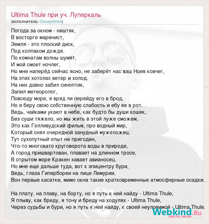 Погода за окном - ништяк, В восторге маренист, Земля - это плоский диск, Под колпаком дождя. По комнатам волны шумят, И мой смоет ночлег, Но мне наперёд сейчас ясно, не заберёт нас ваш Ноев ковчег, На этих хотолах ветер и холод. На них давно забил синоптик, Запил метеоролог, Повсюду море, я вряд ли перейду его в брод, Но я беру свою собственную слабость и ебу ее в рот. Ведь, чайками укают в небе, как будто бы души кошек, Без суши тяжело, но мы жить в этой луже сможем, Это как Голливудский фильм, про водный мир, Который снял очередной занудный мужеложец. Тут сухопутный опыт не пригоден, Что-то многовато круговорота воды в природе, А город пришвартован, плавает на длинном тросе, В отрытом море Кракен хавает авианосец. Но мне еще дальше туда, вот к эпицентру бури, Ведь, глаза Гипербореи на лице Лемурии, Вон первые касатки, мимо окна такие кратковременные атмосферные осадки. На плату, на плаву, на борту, но я путь к ней найду - Ultima Thule, Я плыву, как бреду, я тону и бреду на ходулях - Ultima Thule, Через судьбы и бури, но я путь к ней найду, к своей неуловимой - Ultima Thule.