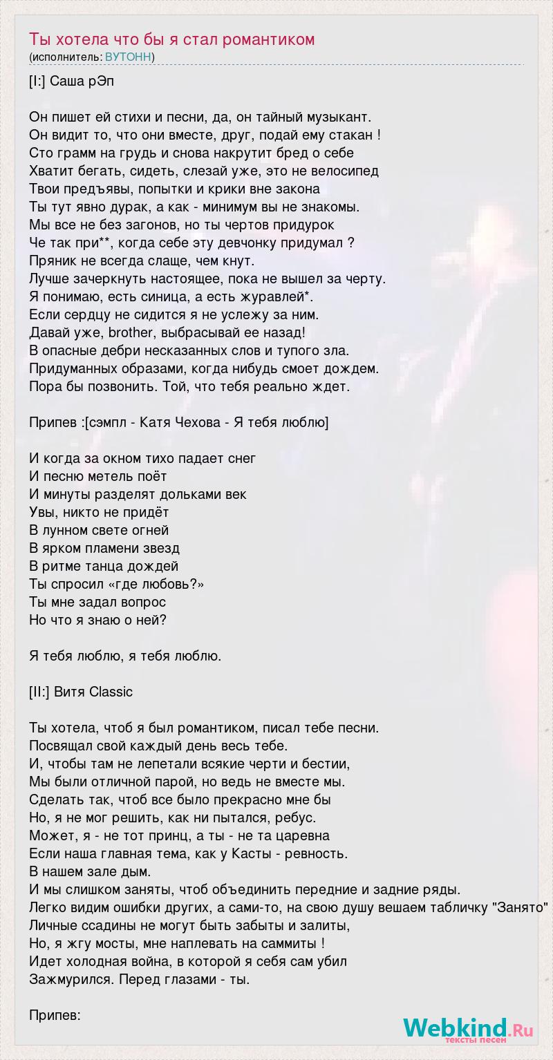 [I:] Саша рЭп Он пишет ей стихи и песни, да, он тайный музыкант. Он видит то, что они вместе, друг, подай ему стакан ! Сто грамм на грудь и снова накрутит бред о себе Хватит бегать, сидеть, слезай уже, это не велосипед Твои предъявы, попытки и крики вне закона Ты тут явно дурак, а как - минимум вы не знакомы. Мы все не без загонов, но ты чертов придурок Че так при**, когда себе эту девчонку придумал ? Пряник не всегда слаще, чем кнут. Лучше зачеркнуть настоящее, пока не вышел за черту. Я понимаю, есть синица, а есть журавлей*. Если сердцу не сидится я не услежу за ним. Давай уже, brother, выбрасывай ее назад! В опасные дебри несказанных слов и тупого зла. Придуманных образами, когда нибудь смоет дождем. Пора бы позвонить. Той, что тебя реально ждет. Припев :[сэмпл - Катя Чехова - Я тебя люблю] И когда за окном тихо падает снег И песню метель поёт И минуты разделят дольками век Увы, никто не придёт В лунном свете огней В ярком пламени звезд В ритме танца дождей Ты спросил «где любовь?» Ты мне задал вопрос Но что я знаю о ней? Я тебя люблю, я тебя люблю. [II:] Витя Classic Ты хотела, чтоб я был романтиком, писал тебе песни. Посвящал свой каждый день весь тебе. И, чтобы там не лепетали всякие черти и бестии, Мы были отличной парой, но ведь не вместе мы. Сделать так, чтоб все было прекрасно мне бы Но, я не мог решить, как ни пытался, ребус. Может, я - не тот принц, а ты - не та царевна Если наша главная тема, как у Касты - ревность. В нашем зале дым. И мы слишком заняты, чтоб объединить передние и задние ряды. Легко видим ошибки других, а сами-то, на свою душу вешаем табличку "Занято" Личные ссадины не могут быть забыты и залиты, Но, я жгу мосты, мне наплевать на саммиты ! Идет холодная война, в которой я себя сам убил Зажмурился. Перед глазами - ты. Припев: