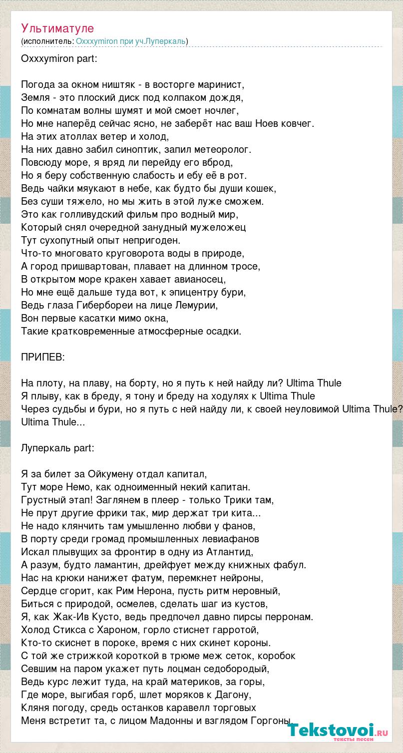 Oxxxymiron part: Погода за окном ништяк - в восторге маринист, Земля - это плоский диск под колпаком дождя, По комнатам волны шумят и мой смоет ночлег, Но мне наперёд сейчас ясно, не заберёт нас ваш Ноев ковчег. На этих атоллах ветер и холод, На них давно забил синоптик, запил метеоролог. Повсюду море, я вряд ли перейду его вброд, Но я беру собственную слабость и ебу её в рот. Ведь чайки мяукают в небе, как будто бы души кошек, Без суши тяжело, но мы жить в этой луже сможем. Это как голливудский фильм про водный мир, Который снял очередной занудный мужеложец Тут сухопутный опыт непригоден. Что-то многовато круговорота воды в природе, А город пришвартован, плавает на длинном тросе, В открытом море кракен хавает авианосец, Но мне ещё дальше туда вот, к эпицентру бури, Ведь глаза Гибербореи на лице Лемурии, Вон первые касатки мимо окна, Такие кратковременные атмосферные осадки. ПРИПЕВ: На плоту, на плаву, на борту, но я путь к ней найду ли? Ultima Thule Я плыву, как в бреду, я тону и бреду на ходулях к Ultima Thule Через судьбы и бури, но я путь с ней найду ли, к своей неуловимой Ultima Thule? Ultima Thule... Луперкаль part: Я за билет за Ойкумену отдал капитал, Тут море Немо, как одноименный некий капитан. Грустный этап! Заглянем в плеер - только Трики там, Не прут другие фрики так, мир держат три кита... Не надо клянчить там умышленно любви у фанов, В порту среди громад промышленных левиафанов Искал плывущих за фронтир в одну из Атлантид, А разум, будто ламантин, дрейфует между книжных фабул. Нас на крюки нанижет фатум, перемкнет нейроны, Сердце сгорит, как Рим Нерона, пусть ритм неровный, Биться с природой, осмелев, сделать шаг из кустов, Я, как Жак-Ив Кусто, ведь предпочел давно пирсы перронам. Холод Стикса с Хароном, горло стиснет гарротой, Кто-то скиснет в пороке, время с них скинет короны. С той же стрижкой короткой в трюме меж сеток, коробок Севшим на паром укажет путь лоцман седобородый, Ведь курс лежит туда, на край материков, за горы, Где море, выгибая горб, шлет моряков к Дагону, Кляня погоду, средь останков каравелл торговых Меня встретит та, с лицом Мадонны и взглядом Горгоны.