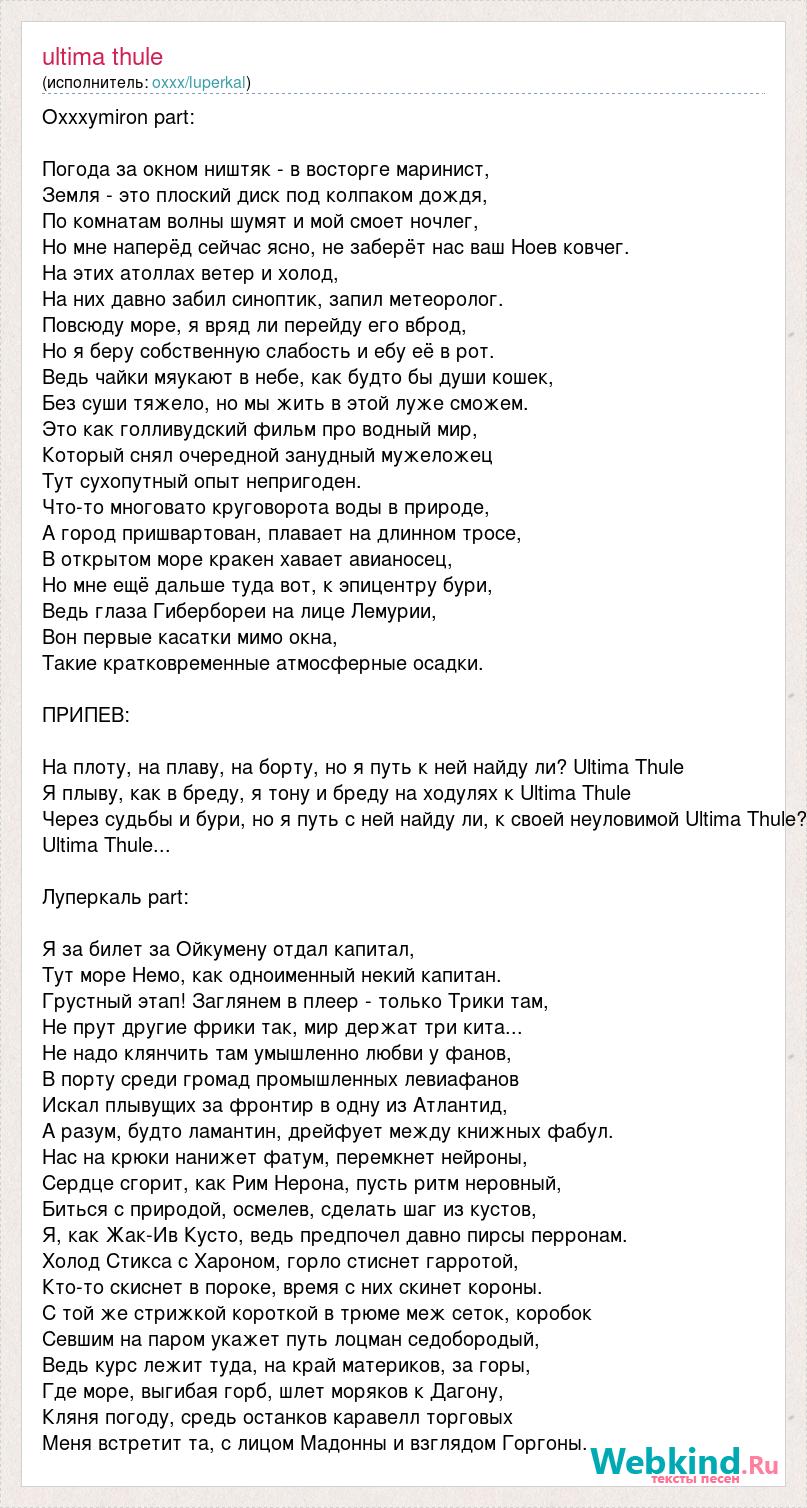 Oxxxymiron part: Погода за окном ништяк - в восторге маринист, Земля - это плоский диск под колпаком дождя, По комнатам волны шумят и мой смоет ночлег, Но мне наперёд сейчас ясно, не заберёт нас ваш Ноев ковчег. На этих атоллах ветер и холод, На них давно забил синоптик, запил метеоролог. Повсюду море, я вряд ли перейду его вброд, Но я беру собственную слабость и ебу её в рот. Ведь чайки мяукают в небе, как будто бы души кошек, Без суши тяжело, но мы жить в этой луже сможем. Это как голливудский фильм про водный мир, Который снял очередной занудный мужеложец Тут сухопутный опыт непригоден. Что-то многовато круговорота воды в природе, А город пришвартован, плавает на длинном тросе, В открытом море кракен хавает авианосец, Но мне ещё дальше туда вот, к эпицентру бури, Ведь глаза Гибербореи на лице Лемурии, Вон первые касатки мимо окна, Такие кратковременные атмосферные осадки. ПРИПЕВ: На плоту, на плаву, на борту, но я путь к ней найду ли? Ultima Thule Я плыву, как в бреду, я тону и бреду на ходулях к Ultima Thule Через судьбы и бури, но я путь с ней найду ли, к своей неуловимой Ultima Thule? Ultima Thule... Луперкаль part: Я за билет за Ойкумену отдал капитал, Тут море Немо, как одноименный некий капитан. Грустный этап! Заглянем в плеер - только Трики там, Не прут другие фрики так, мир держат три кита... Не надо клянчить там умышленно любви у фанов, В порту среди громад промышленных левиафанов Искал плывущих за фронтир в одну из Атлантид, А разум, будто ламантин, дрейфует между книжных фабул. Нас на крюки нанижет фатум, перемкнет нейроны, Сердце сгорит, как Рим Нерона, пусть ритм неровный, Биться с природой, осмелев, сделать шаг из кустов, Я, как Жак-Ив Кусто, ведь предпочел давно пирсы перронам. Холод Стикса с Хароном, горло стиснет гарротой, Кто-то скиснет в пороке, время с них скинет короны. С той же стрижкой короткой в трюме меж сеток, коробок Севшим на паром укажет путь лоцман седобородый, Ведь курс лежит туда, на край материков, за горы, Где море, выгибая горб, шлет моряков к Дагону, Кляня погоду, средь останков каравелл торговых Меня встретит та, с лицом Мадонны и взглядом Горгоны.