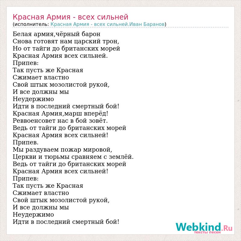 Белая армия,чёрный барон Снова готовят нам царский трон, Но от тайги до британских морей Красная Армия всех сильней. Припев: Так пусть же Красная Сжимает властно Свой штык мозолистой рукой, И все должны мы Неудержимо Идти в последний смертный бой! Красная Армия,марш вперёд! Реввоенсовет нас в бой зовёт. Ведь от тайги до британских морей Красная Армия всех сильней! Припев. Мы раздуваем пожар мировой, Церкви и тюрьмы сравняем с землёй. Ведь от тайги до британских морей Красная Армия всех сильней! Припев: Так пусть же Красная Сжимает властно Свой штык мозолистой рукой, И все должны мы Неудержимо Идти в последний смертный бой!