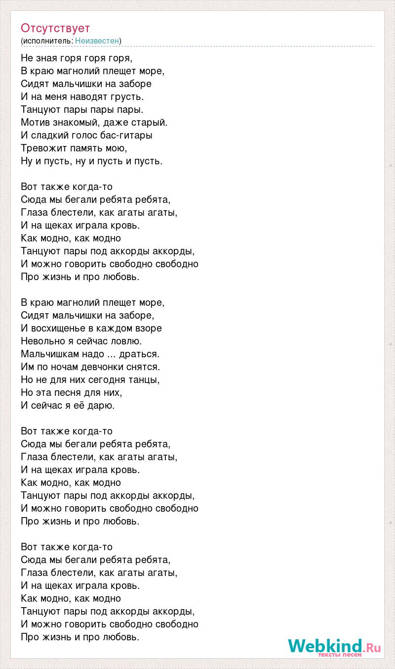 Не зная горя горя горя, В краю магнолий плещет море, Сидят мальчишки на заборе И на меня наводят грусть. Танцуют пары пары пары. Мотив знакомый, даже старый. И сладкий голос бас-гитары Тревожит память мою, Ну и пусть, ну и пусть и пусть. Вот также когда-то Сюда мы бегали ребята ребята, Глаза блестели, как агаты агаты, И на щеках играла кровь. Как модно, как модно Танцуют пары под аккорды аккорды, И можно говорить свободно свободно Про жизнь и про любовь. В краю магнолий плещет море, Сидят мальчишки на заборе, И восхищенье в каждом взоре Невольно я сейчас ловлю. Мальчишкам надо ... драться. Им по ночам девчонки снятся. Но не для них сегодня танцы, Но эта песня для них, И сейчас я её дарю. Вот также когда-то Сюда мы бегали ребята ребята, Глаза блестели, как агаты агаты, И на щеках играла кровь. Как модно, как модно Танцуют пары под аккорды аккорды, И можно говорить свободно свободно Про жизнь и про любовь. Вот также когда-то Сюда мы бегали ребята ребята, Глаза блестели, как агаты агаты, И на щеках играла кровь. Как модно, как модно Танцуют пары под аккорды аккорды, И можно говорить свободно свободно Про жизнь и про любовь.