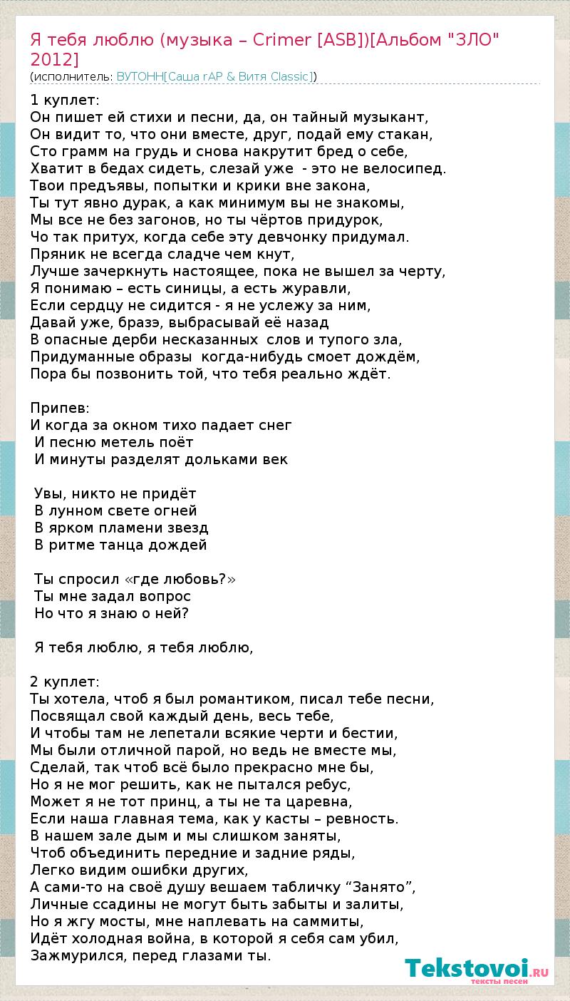 Главная→Исполнители→ВУТОНН[Саша rAP & Витя Classic]→Я тебя люблю (музыка – Crimer [ASB])[Альбом "ЗЛО" 2012]