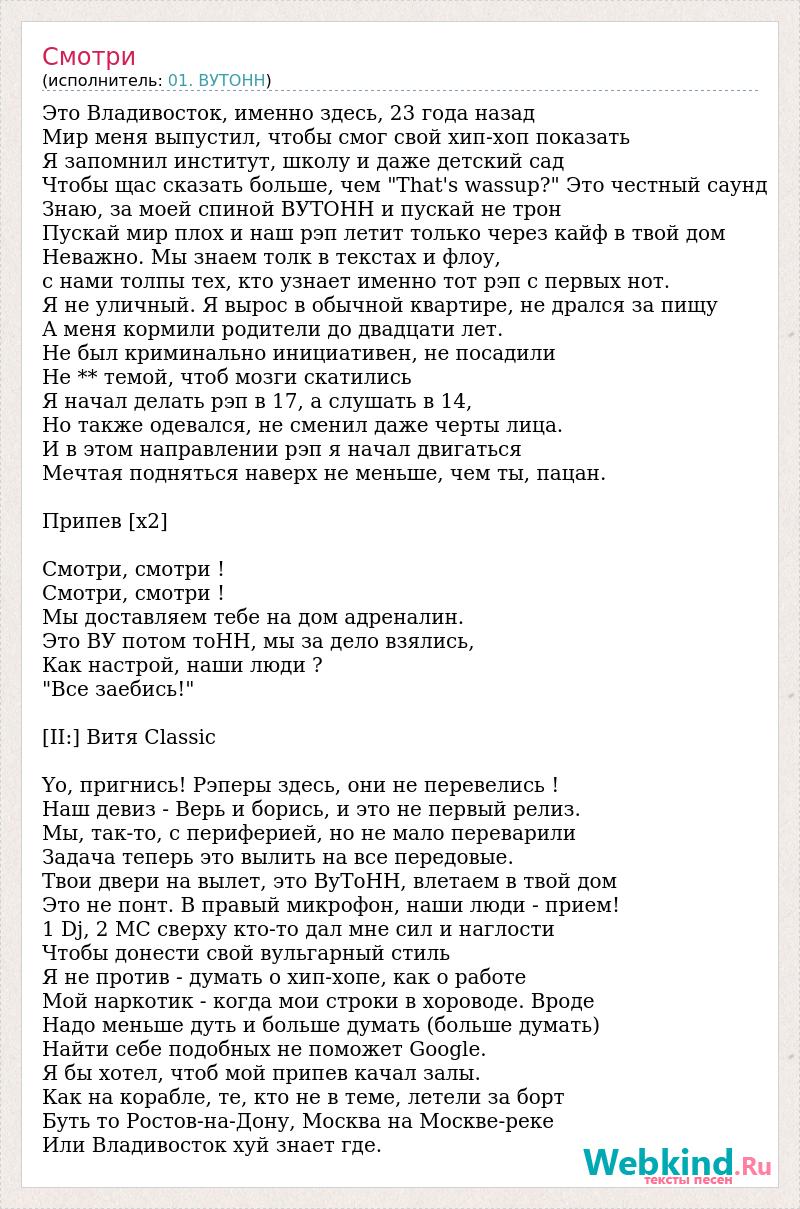 Это Владивосток, именно здесь, 23 года назад Мир меня выпустил, чтобы смог свой хип-хоп показать Я запомнил институт, школу и даже детский сад Чтобы щас сказать больше, чем "That's wassup?" Это честный саунд Знаю, за моей спиной ВУТОНН и пускай не трон Пускай мир плох и наш рэп летит только через кайф в твой дом Неважно. Мы знаем толк в текстах и флоу, с нами толпы тех, кто узнает именно тот рэп с первых нот. Я не уличный. Я вырос в обычной квартире, не дрался за пищу А меня кормили родители до двадцати лет. Не был криминально инициативен, не посадили Не ** темой, чтоб мозги скатились Я начал делать рэп в 17, а слушать в 14, Но также одевался, не сменил даже черты лица. И в этом направлении рэп я начал двигаться Мечтая подняться наверх не меньше, чем ты, пацан. Припев [х2] Смотри, смотри ! Смотри, смотри ! Мы доставляем тебе на дом адреналин. Это ВУ потом тоНН, мы за дело взялись, Как настрой, наши люди ? "Все заебись!" [II:] Витя Classic Yo, пригнись! Рэперы здесь, они не перевелись ! Наш девиз - Верь и борись, и это не первый релиз. Мы, так-то, с периферией, но не мало переварили Задача теперь это вылить на все передовые. Твои двери на вылет, это ВуТоНН, влетаем в твой дом Это не понт. В правый микрофон, наши люди - прием! 1 Dj, 2 MC сверху кто-то дал мне сил и наглости Чтобы донести свой вульгарный стиль Я не против - думать о хип-хопе, как о работе Мой наркотик - когда мои строки в хороводе. Вроде Надо меньше дуть и больше думать (больше думать) Найти себе подобных не поможет Google. Я бы хотел, чтоб мой припев качал залы. Как на корабле, те, кто не в теме, летели за борт Буть то Ростов-на-Дону, Москва на Москве-реке Или Владивосток хуй знает где.