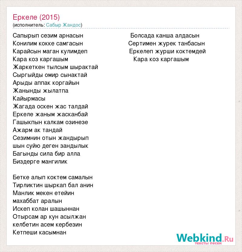 Сапырып сезим арнасын Болсада канша алдасын Конилим кокке самгасын Сертимен журек танбасын Карайсын маган кулимдеп Еркелеп журши коктемдей Кара коз каргашым Кара коз каргашым Жаркеткен тылсым шырактай Сыргыйды омир сынактай Арыды аппак коргайын Жанынды жылатпа Кайырмасы Жагада оскен жас талдай Еркеле жаным жасканбай Гашыкпын калкам озинезе Ажарм ак тандай Сезимнин отын жандырып шын суйю деген зандылык Багынды сила бир алла Биздерге мангилик Бетке алып коктем самалын Тирликтин шыркап бал анин Манлик мекен етейин махаббат аралын Искеп колан шашыннан Отырсам ар кун асылжан келбетин асем кербезин Кетпеши касымнан