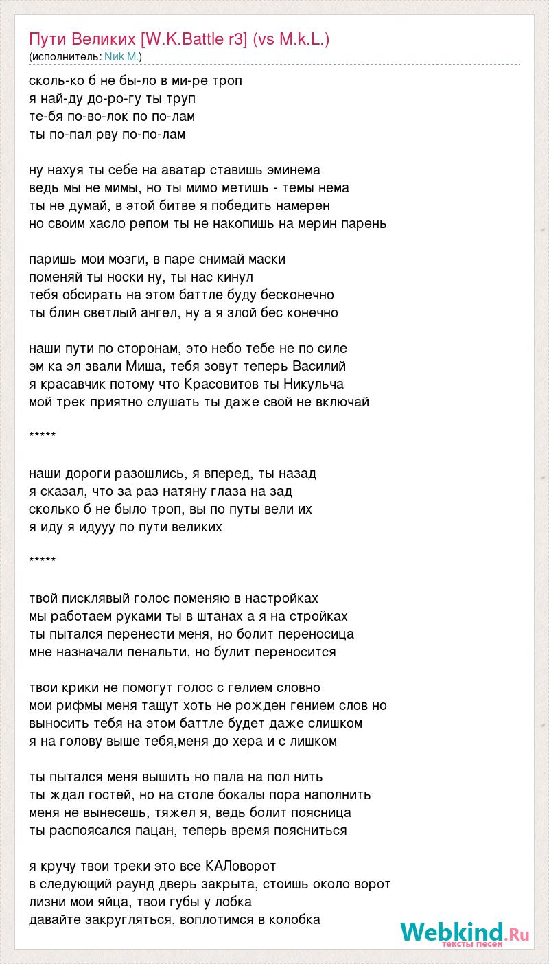 сколь-ко б не бы-ло в ми-ре троп я най-ду до-ро-гу ты труп те-бя по-во-лок по по-лам ты по-пал рву по-по-лам ну нахуя ты себе на аватар ставишь эминема ведь мы не мимы, но ты мимо метишь - темы нема ты не думай, в этой битве я победить намерен но своим хасло репом ты не накопишь на мерин парень паришь мои мозги, в паре снимай маски поменяй ты носки ну, ты нас кинул тебя обсирать на этом баттле буду бесконечно ты блин светлый ангел, ну а я злой бес конечно наши пути по сторонам, это небо тебе не по силе эм ка эл звали Миша, тебя зовут теперь Василий я красавчик потому что Красовитов ты Никульча мой трек приятно слушать ты даже свой не включай ***** наши дороги разошлись, я вперед, ты назад я сказал, что за раз натяну глаза на зад сколько б не было троп, вы по путы вели их я иду я идууу по пути великих ***** твой писклявый голос поменяю в настройках мы работаем руками ты в штанах а я на стройках ты пытался перенести меня, но болит переносица мне назначали пенальти, но булит переносится твои крики не помогут голос с гелием словно мои рифмы меня тащут хоть не рожден гением слов но выносить тебя на этом баттле будет даже слишком я на голову выше тебя,меня до хера и с лишком ты пытался меня вышить но пала на пол нить ты ждал гостей, но на столе бокалы пора наполнить меня не вынесешь, тяжел я, ведь болит поясница ты распоясался пацан, теперь время поясниться я кручу твои треки это все КАЛоворот в следующий раунд дверь закрыта, стоишь около ворот лизни мои яйца, твои губы у лобка давайте закругляться, воплотимся в колобка