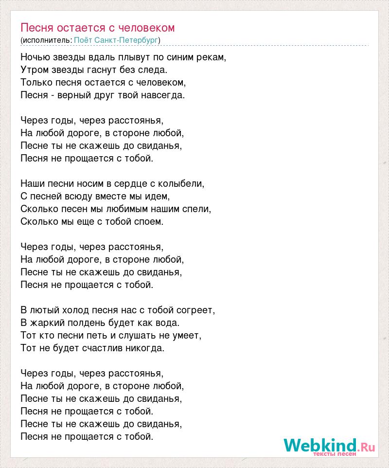 Ночью звезды вдаль плывут по синим рекам, Утром звезды гаснут без следа. Только песня остается с человеком, Песня - верный друг твой навсегда. Через годы, через расстоянья, На любой дороге, в стороне любой, Песне ты не скажешь до свиданья, Песня не прощается с тобой. Наши песни носим в сердце с колыбели, С песней всюду вместе мы идем, Сколько песен мы любимым нашим спели, Сколько мы еще с тобой споем. Через годы, через расстоянья, На любой дороге, в стороне любой, Песне ты не скажешь до свиданья, Песня не прощается с тобой. В лютый холод песня нас с тобой согреет, В жаркий полдень будет как вода. Тот кто песни петь и слушать не умеет, Тот не будет счастлив никогда. Через годы, через расстоянья, На любой дороге, в стороне любой, Песне ты не скажешь до свиданья, Песня не прощается с тобой. Песне ты не скажешь до свиданья, Песня не прощается с тобой.
