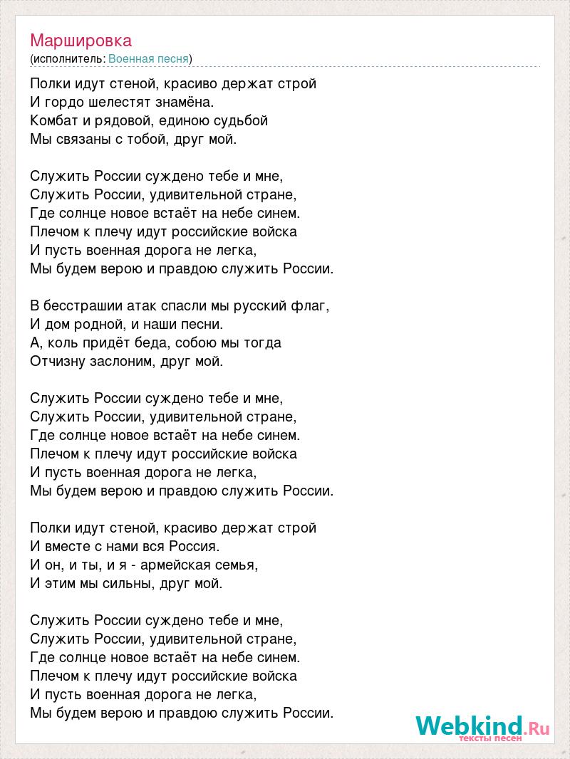 Полки идут стеной, красиво держат строй И гордо шелестят знамёна. Комбат и рядовой, единою судьбой Мы связаны с тобой, друг мой. Служить России суждено тебе и мне, Служить России, удивительной стране, Где солнце новое встаёт на небе синем. Плечом к плечу идут российские войска И пусть военная дорога не легка, Мы будем верою и правдою служить России. В бесстрашии атак спасли мы русский флаг, И дом родной, и наши песни. А, коль придёт беда, собою мы тогда Отчизну заслоним, друг мой. Служить России суждено тебе и мне, Служить России, удивительной стране, Где солнце новое встаёт на небе синем. Плечом к плечу идут российские войска И пусть военная дорога не легка, Мы будем верою и правдою служить России. Полки идут стеной, красиво держат строй И вместе с нами вся Россия. И он, и ты, и я - армейская семья, И этим мы сильны, друг мой. Служить России суждено тебе и мне, Служить России, удивительной стране, Где солнце новое встаёт на небе синем. Плечом к плечу идут российские войска И пусть военная дорога не легка, Мы будем верою и правдою служить России.