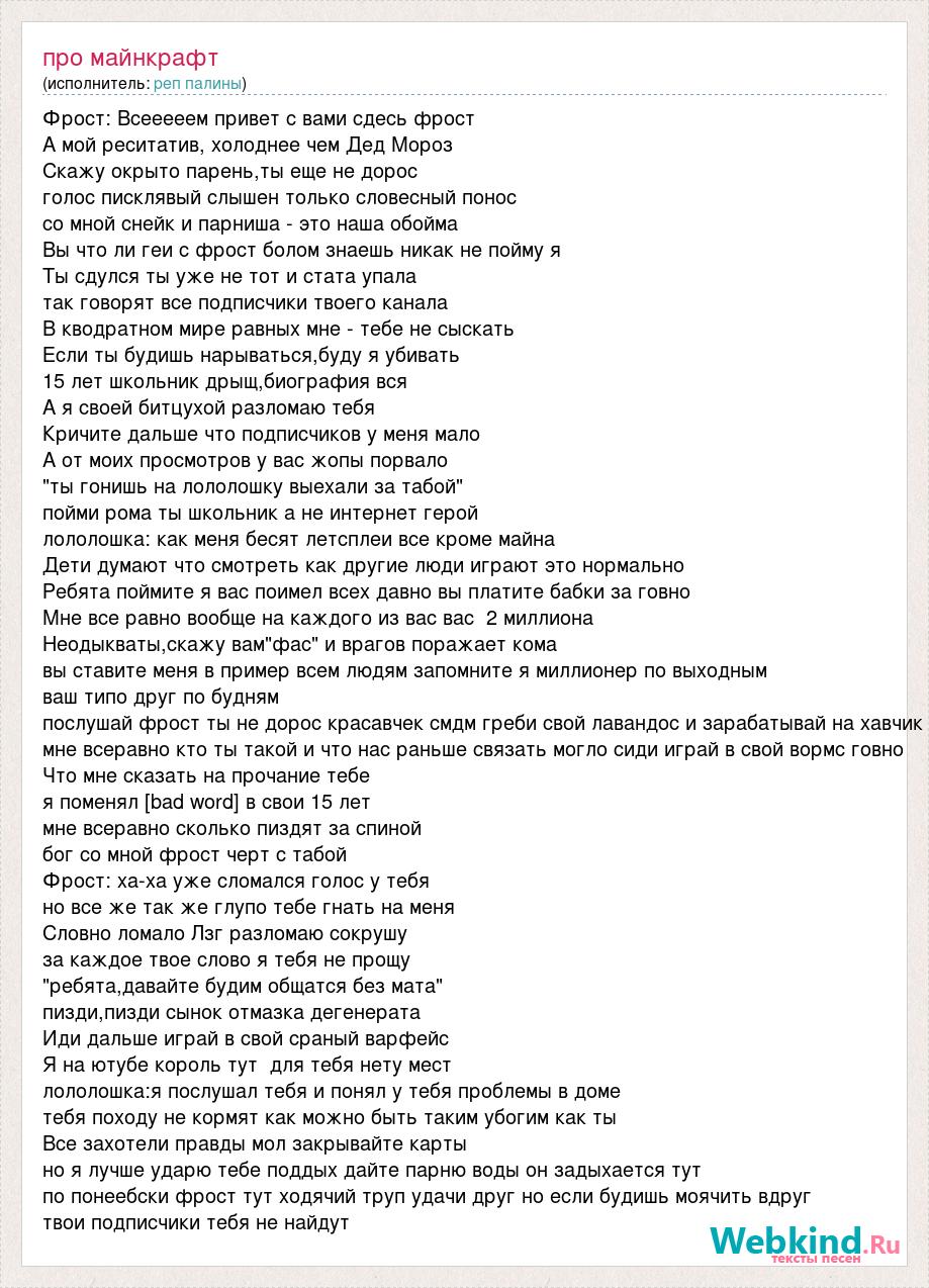 Фрост: Всееееем привет с вами сдесь фрост А мой реситатив, холоднее чем Дед Мороз Скажу окрыто парень,ты еще не дорос голос писклявый слышен только словесный понос со мной снейк и парниша - это наша обойма Вы что ли геи с фрост болом знаешь никак не пойму я Ты сдулся ты уже не тот и стата упала так говорят все подписчики твоего канала В кводратном мире равных мне - тебе не сыскать Если ты будишь нарываться,буду я убивать 15 лет школьник дрыщ,биография вся А я своей битцухой разломаю тебя Кричите дальше что подписчиков у меня мало А от моих просмотров у вас жопы порвало "ты гонишь на лололошку выехали за табой" пойми рома ты школьник а не интернет герой лололошка: как меня бесят летсплеи все кроме майна Дети думают что смотреть как другие люди играют это нормально Ребята поймите я вас поимел всех давно вы платите бабки за говно Мне все равно вообще на каждого из вас вас 2 миллиона Неодыкваты,скажу вам"фас" и врагов поражает кома вы ставите меня в пример всем людям запомните я миллионер по выходным ваш типо друг по будням послушай фрост ты не дорос красавчек смдм греби свой лавандос и зарабатывай на хавчик мне всеравно кто ты такой и что нас раньше связать могло сиди играй в свой вормс говно Что мне сказать на прочание тебе я поменял [bad word] в свои 15 лет мне всеравно сколько пиздят за спиной бог со мной фрост черт с табой Фрост: ха-ха уже сломался голос у тебя но все же так же глупо тебе гнать на меня Словно ломало Лзг разломаю сокрушу за каждое твое слово я тебя не прощу "ребята,давайте будим общатся без мата" пизди,пизди сынок отмазка дегенерата Иди дальше играй в свой сраный варфейс Я на ютубе король тут для тебя нету мест лололошка:я послушал тебя и понял у тебя проблемы в доме тебя походу не кормят как можно быть таким убогим как ты Все захотели правды мол закрывайте карты но я лучше ударю тебе поддых дайте парню воды он задыхается тут по понеебски фрост тут ходячий труп удачи друг но если будишь моячить вдруг твои подписчики тебя не найдут