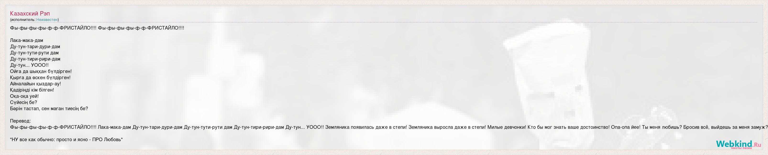 Фы-фы-фы-фы-ф-ф-ФРИСТАЙЛО!!!! Фы-фы-фы-фы-ф-ф-ФРИСТАЙЛО!!!! Лака-мака-дам Ду-тун-тари-дури-дам Ду-тун-тути-рути дам Ду-тун-тири-рири-дам Ду-тун... УООО!! Ойға да шыққан бүлдірген! Қырға да өскен бүлдірген! Айналайын қыздар-ау! Қадіріңді кім білген! Оқа-оқа уей! Сүйесің бе? Бәрін тастап, сен маған тиесің бе? Перевод: Фы-фы-фы-фы-ф-ф-ФРИСТАЙЛО!!!! Лака-мака-дам Ду-тун-тари-дури-дам Ду-тун-тути-рути дам Ду-тун-тири-рири-дам Ду-тун... УООО!! Земляника появилась даже в степи! Земляника выросла даже в степи! Милые девчонки! Кто бы мог знать ваше достоинство! Опа-опа йее! Ты меня любишь? Бросив всё, выйдешь за меня замуж? "НУ все как обычно: просто и ясно - ПРО Любовь"