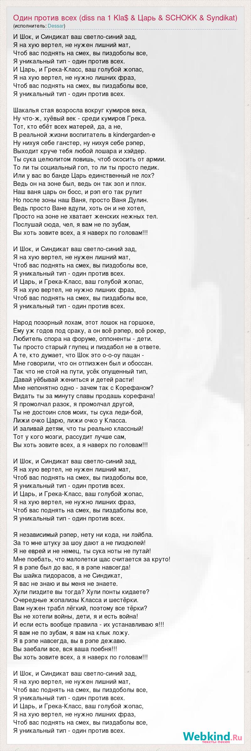 И Шок, и Синдикат ваш светло-синий зад, Я на хую вертел, не нужен лишний мат, Чтоб вас поднять на смех, вы пиздоболы все, Я уникальный тип - один против всех. И Царь, и Грека-Класс, ваш голубой жопас, Я на хую вертел, не нужно лишних фраз, Чтоб вас поднять на смех, вы пиздаболы все, Я уникальный тип - один против всех. Шакалья стая возросла вокруг кумиров века, Ну что-ж, хуёвый век - среди кумиров Грека. Тот, кто ебёт всех матерей, да, а не, В реальной жизни воспитатель в kindergarden-е Ну нихуя себе ганстер, ну нихуя себе рэпер, Выходит круче тебя любой лошара и хэйдер. Ты сука целюлитом ловишь, чтоб окосить от армии. То ли ты социальный гоп, то ли ты просто педик. Или у вас во банде Царь единственный не лох? Ведь он на зоне был, ведь он так зол и плох. Наш ваня царь он босс, и рэп его так рулит Но после зоны наш Ваня, просто Ваня Дулин. Ведь просто Ване вдули, хоть он и не хотел, Просто на зоне не хватает женских нежных тел. Послушай сюда, чел, я вам не по зубам, Вы хоть зовите всех, а я наверх по головам!!! И Шок, и Синдикат ваш светло-синий зад, Я на хую вертел, не нужен лишний мат, Чтоб вас поднять на смех, вы пиздоболы все, Я уникальный тип - один против всех. И Царь, и Грека-Класс, ваш голубой жопас, Я на хую вертел, не нужно лишних фраз, Чтоб вас поднять на смех, вы пиздаболы все, Я уникальный тип - один против всех. Народ позорный лохам, этот лошок на горшоке, Ему уж годов под сраку, а он всё рэпер, всё рокер, Любитель спора на форуме, оппоненты - дети. Ты просто старый глупец и пиздабол не в ответе. А те, кто думает, что Шок это о-о-оу пацан - Мне говорили, что он отпизжен был и обоссан. Так что не стой на пути, усёк опущенный тип, Давай уёбывай жениться и детей расти! Мне непонятно одно - зачем так с Корефаном? Видать ты за минуту славы продашь корефана! Я промолчал разок, я промолчал другой, Ты не достоин слов моих, ты сука леди-бой, Лижи очко Царю, лижи очко у Класса. И заливай детям, что ты реально классный! Тот у кого мозги, рассудит лучше сам, Вы хоть зовите всех, а я наверх по головам!!! И Шок, и Синдикат ваш светло-синий зад, Я на хую вертел, не нужен лишний мат, Чтоб вас поднять на смех, вы пиздоболы все, Я уникальный тип - один против всех. И Царь, и Грека-Класс, ваш голубой жопас, Я на хую вертел, не нужно лишних фраз, Чтоб вас поднять на смех, вы пиздаболы все, Я уникальный тип - один против всех. Я независимый рэпер, нету ни кода, ни лэйбла. За то мне штуку за шоу дают а не пиздюлей! Я не еврей и не немец, ты сука ноты не путай! Мне поебать, что малолетки щас считается за круто! Я в рэпе был до вас, я в рэпе навсегда! Вы шайка пидорасов, а не Синдикат, Я вас не знаю и вы меня не знаете. Хули пиздите вы тогда? Хули понты кидаете? Очередные жопализы Класса и шестёрки. Вам нужен трабл лёгкий, поэтому все тёрки? Вы не хотели войны, дети, я и есть война! И если есть вообще правила - их устанавливаю я!!! Я вам не по зубам, я вам на клык ложу. Я в рэпе навсегда, вы в рэпе дежавю. Вы заебали все, вся ваша поебня!!! Вы хоть зовите всех, а я наверх по головам!!! И Шок, и Синдикат ваш светло-синий зад, Я на хую вертел, не нужен лишний мат, Чтоб вас поднять на смех, вы пиздоболы все, Я уникальный тип - один против всех. И Царь, и Грека-Класс, ваш голубой жопас, Я на хую вертел, не нужно лишних фраз, Чтоб вас поднять на смех, вы пиздаболы все, Я уникальный тип - один против всех.