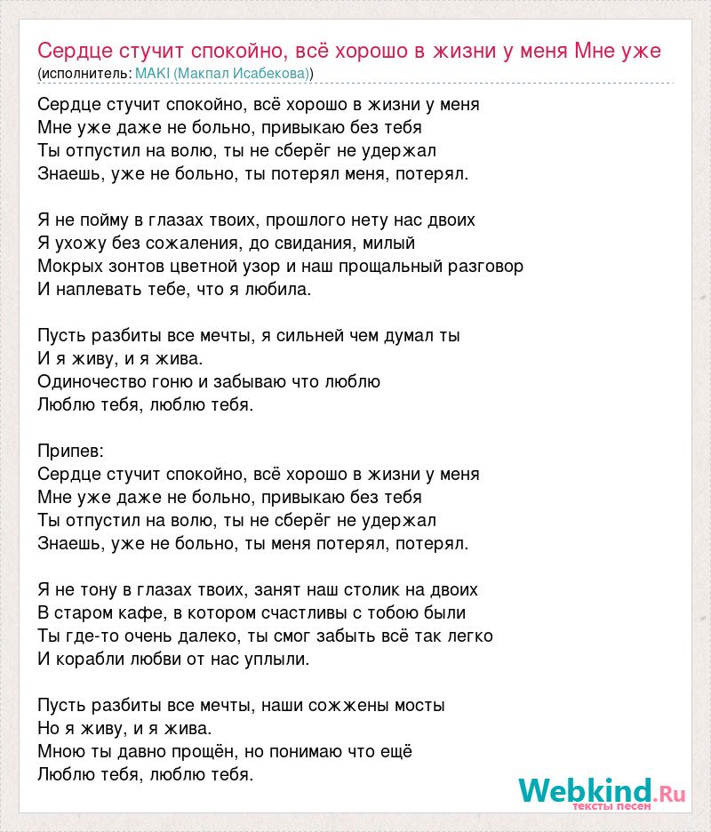 Сердце стучит спокойно, всё хорошо в жизни у меня Мне уже даже не больно, при