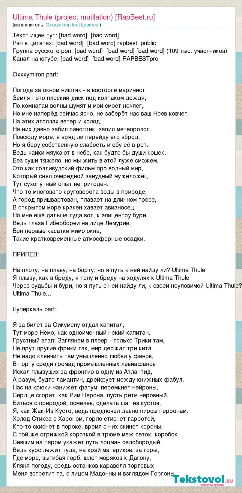 Текст ищем тут: [bad word] [bad word] Рэп в цитатах: [bad word] [bad word] rapbest_public Группа русского рэп: [bad word] [bad word] rapbestru (109 тыс. участников) Канал на ютубе: [bad word] [bad word] RAPBESTpro Oxxxymiron part: Погода за окном ништяк - в восторге маринист, Земля - это плоский диск под колпаком дождя, По комнатам волны шумят и мой смоет ночлег, Но мне наперёд сейчас ясно, не заберёт нас ваш Ноев ковчег. На этих атоллах ветер и холод, На них давно забил синоптик, запил метеоролог. Повсюду море, я вряд ли перейду его вброд, Но я беру собственную слабость и ебу её в рот. Ведь чайки мяукают в небе, как будто бы души кошек, Без суши тяжело, но мы жить в этой луже сможем. Это как голливудский фильм про водный мир, Который снял очередной занудный мужеложец Тут сухопутный опыт непригоден. Что-то многовато круговорота воды в природе, А город пришвартован, плавает на длинном тросе, В открытом море кракен хавает авианосец, Но мне ещё дальше туда вот, к эпицентру бури, Ведь глаза Гибербореи на лице Лемурии, Вон первые касатки мимо окна, Такие кратковременные атмосферные осадки. ПРИПЕВ: На плоту, на плаву, на борту, но я путь к ней найду ли? Ultima Thule Я плыву, как в бреду, я тону и бреду на ходулях к Ultima Thule Через судьбы и бури, но я путь с ней найду ли, к своей неуловимой Ultima Thule? Ultima Thule... Луперкаль part: Я за билет за Ойкумену отдал капитал, Тут море Немо, как одноименный некий капитан. Грустный этап! Заглянем в плеер - только Трики там, Не прут другие фрики так, мир держат три кита... Не надо клянчить там умышленно любви у фанов, В порту среди громад промышленных левиафанов Искал плывущих за фронтир в одну из Атлантид, А разум, будто ламантин, дрейфует между книжных фабул. Нас на крюки нанижет фатум, перемкнет нейроны, Сердце сгорит, как Рим Нерона, пусть ритм неровный, Биться с природой, осмелев, сделать шаг из кустов, Я, как Жак-Ив Кусто, ведь предпочел давно пирсы перронам. Холод Стикса с Хароном, горло стиснет гарротой, Кто-то скиснет в пороке, время с них скинет короны. С той же стрижкой короткой в трюме меж сеток, коробок Севшим на паром укажет путь лоцман седобородый, Ведь курс лежит туда, на край материков, за горы, Где море, выгибая горб, шлет моряков к Дагону, Кляня погоду, средь останков каравелл торговых Меня встретит та, с лицом Мадонны и взглядом Горгоны