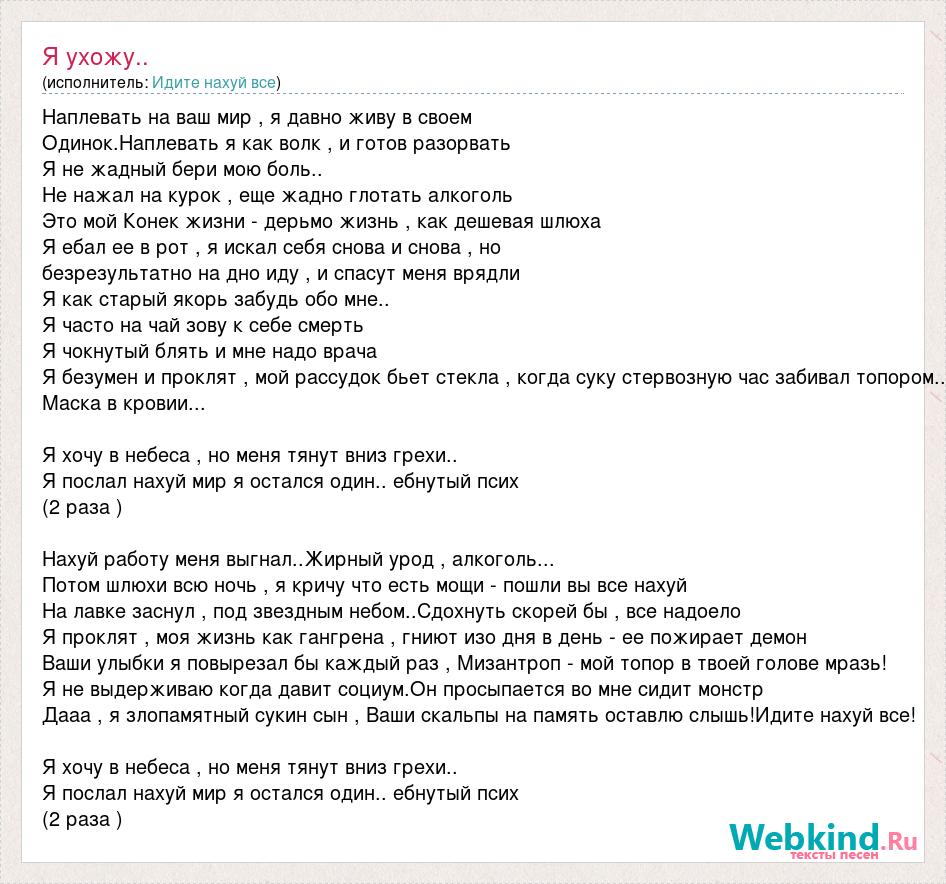 Наплевать на ваш мир , я давно живу в своем Одинок.Наплевать я как волк , и готов разорвать Я не жадный бери мою боль.. Не нажал на курок , еще жадно глотать алкоголь Это мой Конек жизни - дерьмо жизнь , как дешевая шлюха Я ебал ее в рот , я искал себя снова и снова , но безрезультатно на дно иду , и спасут меня врядли Я как старый якорь забудь обо мне.. Я часто на чай зову к себе смерть Я чокнутый блять и мне надо врача Я безумен и проклят , мой рассудок бьет стекла , когда суку стервозную час забивал топором.. Маска в кровии... Я хочу в небеса , но меня тянут вниз грехи.. Я послал нахуй мир я остался один.. ебнутый псих (2 раза ) Нахуй работу меня выгнал..Жирный урод , алкоголь... Потом шлюхи всю ночь , я кричу что есть мощи - пошли вы все нахуй На лавке заснул , под звездным небом..Сдохнуть скорей бы , все надоело Я проклят , моя жизнь как гангрена , гниют изо дня в день - ее пожирает демон Ваши улыбки я повырезал бы каждый раз , Мизантроп - мой топор в твоей голове мразь! Я не выдерживаю когда давит социум.Он просыпается во мне сидит монстр Дааа , я злопамятный сукин сын , Ваши скальпы на память оставлю слышь!Идите нахуй все! Я хочу в небеса , но меня тянут вниз грехи.. Я послал нахуй мир я остался один.. ебнутый псих (2 раза )