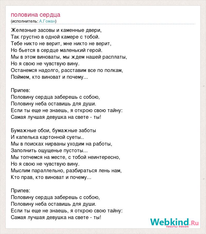 Железные засовы и каменные двери, Так грустно в одной камере с тобой. Тебе никто не верит, мне никто не верит, Но бьется в сердце маленький герой. Мы в этом виноваты, мы ждем нашей расплаты, Но я свою не чувствую вину. Останемся надолго, расставим все по полкам, Поймем, кто виноват и почему... Припев: Половину сердца заберешь с собою, Половину неба оставишь для души. Если ты еще не знаешь, я открою свою тайну: Самая лучшая девушка на свете - ты! Бумажные обои, бумажные заботы И капелька картонной суеты.. Мы в поисках нирваны уходим на работы, Заполнить ощущенье пустоты... Мы топчемся на месте, с тобой неинтересно, Но я свою не чувствую вину. Мыслим параллельно, разбираться лень нам, Кто прав, кто виноват и почему... Припев: Половину сердца заберешь с собою, Половину неба оставишь для души. Если ты еще не знаешь, я открою свою тайну: Самая лучшая девушка на свете - ты!