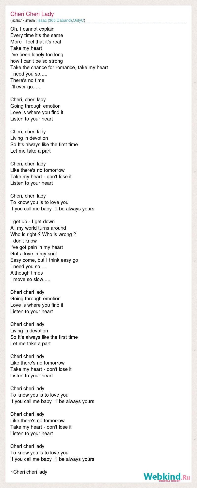 Oh, I cannot explain Every time it's the same More I feel that it's real Take my heart I've been lonely too long how I can't be so strong Take the chance for romance, take my heart I need you so..... There's no time I'll ever go..... Cheri, cheri lady Going through emotion Love is where you find it Listen to your heart Cheri, cheri lady Living in devotion So It's always like the first time Let me take a part Cheri, cheri lady Like there's no tomorrow Take my heart - don't lose it Listen to your heart Cheri, cheri lady To know you is to love you If you call me baby I'll be always yours I get up - I get down All my world turns around Who is right ? Who is wrong ? I don't know I've got pain in my heart Got a love in my soul Easy come, but I think easy go I need you so..... Although times I move so slow..... Cheri cheri lady Going through emotion Love is where you find it Listen to your heart Cheri cheri lady Living in devotion So It's always like the first time Let me take a part Cheri cheri lady Like there's no tomorrow Take my heart - don't lose it Listen to your heart Cheri cheri lady To know you is to love you If you call me baby I'll be always yours Cheri cheri lady Like there's no tomorrow Take my heart - don't lose it Listen to your heart Cheri cheri lady To know you is to love you If you call me baby I'll be always yours ~Cheri cheri lady