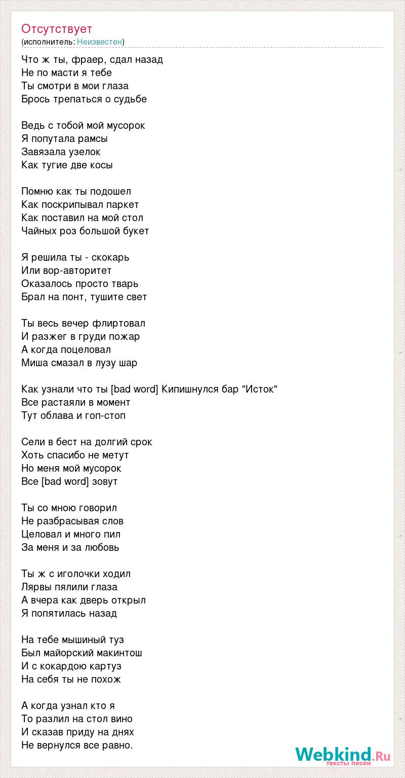 Что ж ты, фраер, сдал назад Не по масти я тебе Ты смотри в мои глаза Брось трепаться о судьбе Ведь с тобой мой мусорок Я попутала рамсы Завязала узелок Как тугие две косы Помню как ты подошел Как поскрипывал паркет Как поставил на мой стол Чайных роз большой букет Я решила ты - скокарь Или вор-авторитет Оказалось просто тварь Брал на понт, тушите свет Ты весь вечер флиртовал И разжег в груди пожар А когда поцеловал Миша смазал в лузу шар Как узнали что ты [bad word] Кипишнулся бар "Исток" Все растаяли в момент Тут облава и гоп-стоп Сели в бест на долгий срок Хоть спасибо не метут Но меня мой мусорок Все [bad word] зовут Ты со мною говорил Не разбрасывая слов Целовал и много пил За меня и за любовь Ты ж с иголочки ходил Лярвы пялили глаза А вчера как дверь открыл Я попятилась назад На тебе мышиный туз Был майорский макинтош И с кокардою картуз На себя ты не похож А когда узнал кто я То разлил на стол вино И сказав приду на днях Не вернулся все равно.