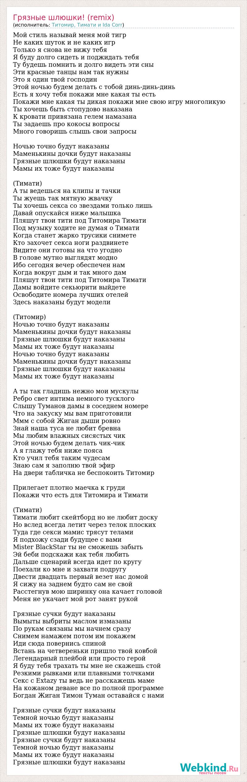 Мой стиль называй меня мой тигр Не каких шуток и не каких игр Только я снова не вижу тебя Я буду долго сидеть и поджидать тебя Ту будешь помнить и долго видеть эти сны Эти красные танцы нам так нужны Это я один твой господин Этой ночью будем делать с тобой динь-динь-динь Есть я хочу тебя покажи мне какая ты есть Покажи мне какая ты дикая покажи мне свою игру многоликую Ты хочешь быть стопудово наказана К кровати привязана гелем намазана Ты задаешь про кокосы вопросы Много говоришь слышь свои запросы Ночью точно будут наказаны Маменькины дочки будут наказаны Грязные шлюшки будут наказаны Мамы их тоже будут наказаны (Тимати) А ты ведешься на клипы и тачки Ты жуешь так мятную жвачку Ты хочешь секса со звездами только лишь Давай опускайся ниже малышка Пляшут твои тити под Титомира Тимати Под музыку ходите не думая о Тимати Когда станет жарко трусики снимете Кто захочет секса ноги раздвинете Видите они готовы на что угодно В голове мутно выглядят модно Ибо сегодня вечер обеспечен нам Когда вокруг дым и так много дам Пляшут твои тити под Титомира Тимати Дамы войдите секьюрити выйдете Освободите номера лучших отелей Здесь наказаны будут модели (Титомир) Ночью точно будут наказаны Маменькины дочки будут наказаны Грязные шлюшки будут наказаны Мамы их тоже будут наказаны Ночью точно будут наказаны Маменькины дочки будут наказаны Грязные шлюшки будут наказаны Мамы их тоже будут наказаны А ты так гладишь нежно мои мускулы Ребро свет интима немного тусклого Слышу Туманов дамы в соседнем номере Что на закуску мы вам приготовили Ммм с собой Жиган дыши ровно Знай наша туса не любит бревна Мы любим влажных сисястых чик Этой ночью будем делать чик-чик А я глажу тебя ниже пояса Кто учил тебя таким чудесам Знаю сам я заполню твой эфир На двери табличка не беспокоить Титомир Прилегает плотно маечка к груди Покажи что есть для Титомира и Тимати (Тимати) Тимати любит скейтборд но не любит доску Но вслед всегда летит через телок плоских Туда где секси мамис трясут телами Я подхожу сзади будущее с вами Mister BlackStar ты не сможешь забыть Эй беби подскажи как тебя любить Дальше сценарий всегда идет по кругу Поехали ко мне и захвати подругу Двести двадцать первый везет нас домой Я сижу на заднем будто сам не свой Расстегнув мою ширинку она качает головой Меня не укачает мой рот занят рукой Грязные сучки будут наказаны Вымыты выбриты маслом измазаны По рукам связаны мы начнем сразу Снимем намажем потом им покажем Иди сюда повернись спиной Встань на четвереньки пришло твой ковбой Легендарный плейбой или просто герой Я буду тебя трахать ты мне не скажешь стой Резкими рывками или плавными толчками Секс с Extazy ты ведь не расскажешь маме На кожаном деване все по полной программе Богдан Жиган Тимон Туман оставайся с нами Грязные сучки будут наказаны Темной ночью будут наказаны Мамы их тоже будут наказаны Грязные шлюшки будут наказаны Грязные сучки будут наказаны Темной ночью будут наказаны Мамы их тоже будут наказаны Грязные шлюшки будут наказаны