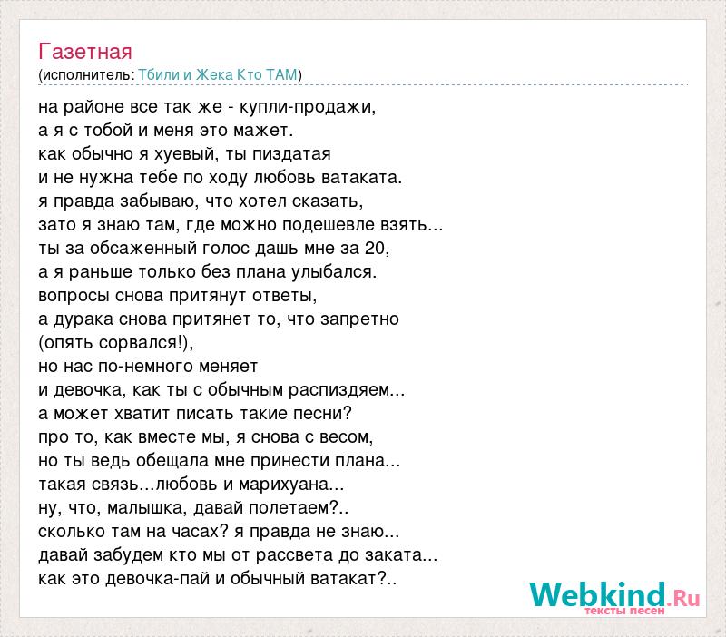 на районе все так же - купли-продажи, а я с тобой и меня это мажет. как обычно я хуевый, ты пиздатая и не нужна тебе по ходу любовь ватаката. я правда забываю, что хотел сказать, зато я знаю там, где можно подешевле взять... ты за обсаженный голос дашь мне за 20, а я раньше только без плана улыбался. вопросы снова притянут ответы, а дурака снова притянет то, что запретно (опять сорвался!), но нас по-немного меняет и девочка, как ты с обычным распиздяем... а может хватит писать такие песни? про то, как вместе мы, я снова с весом, но ты ведь обещала мне принести плана... такая связь...любовь и марихуана... ну, что, малышка, давай полетаем?.. сколько там на часах? я правда не знаю... давай забудем кто мы от рассвета до заката... как это девочка-пай и обычный ватакат?..