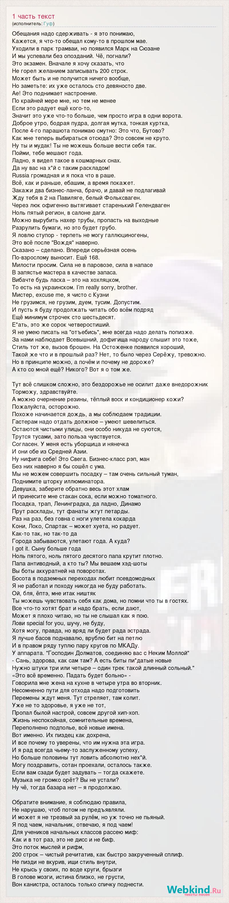 Обещания надо сдерживать - я это понимаю, Кажется, я что-то обещал кому-то в прошлом мае. Уходили в парк трамваи, но появился Марк на Сюзане И мы успевали без опозданий. Чё, погнали? Это экзамен. Вначале я хочу сказать, что Не горел желанием записывать 200 строк. Может быть и не получится ничего вообще, Но заметьте: их уже осталось сто девяносто две. Ае! Это поднимает настроение. По крайней мере мне, но тем не менее Если это радует ещё кого-то, Значит это уже что-то больше, чем просто игра в одни ворота. Доброе утро, бодрая пудра, долгая мутка, тонкая куртка, После 4-го парашюта понимаю смутно: Это что, Бутово? Как мне теперь выбираться отсюда? Это совсем не круто. Ну ты и мудак! Ты не можешь больше вести себя так. Пойми, тебе мешают года. Ладно, я видел такое в кошмарных снах. Да ну вас на х*й с таким раскладом! Russia громадная и я пока что в раше. Всё, как и раньше, ебашим, а время покажет. Закажи два бизнес-ланча, брачо, и давай не подлагивай Жду тебя в 2 на Павиляге, белый Фольксваген. Через люк офигенно вытягивает старенький Гелендваген Ноль пятый регион, в салоне даги. Можно вырубить нахер трубы, пропасть на выходные Разрулить бумаги, но это будет грубо. Я ловлю ступор - терпеть не могу галлюциногены, Это всё после "Вождя" наверно. Сказано – сделано. Впереди серьёзная осень По-взрослому выносит. Ещё 168. Милости просим. Сила не в паровозе, сила в напасе В запястье мастера в качестве запаса. Вибачте будь ласка – это на хохляцком, То есть на украинском. I’m really sorry, brother. Мистер, excuse me, я чисто с Кузни Не грузимся, не грузим, дуем, тусим. Допустим. И пусть я буду продолжать читать обо всём подряд Ещё минимум строчек сто шестьдесят. Е*ать, это же сорок четверостиший. Я не умею писать на "отъебись", мне всегда надо делать попизже. За нами наблюдает Всевышний, дофигища народу слышит это тоже, Стиль тот же, вызов брошен. На Остоженке появился хороший, Такой же что и в прошлый раз? Нет, то было через Серёжу, тревожно. Но в принципе можно, а почём и почему не дороже? А кто со мной ещё? Никого? Вот я о том же. Тут всё слишком сложно, это бездорожье не осилит даже внедорожник Торможу, здравствуйте. А можно очернение резины, тёплый воск и кондиционер кожи? Пожалуйста, осторожно. Похоже начинается дождь, а мы соблюдаем традиции. Гастерам надо отдать должное – умеют шевелиться. Остаются чистыми улицы, они особо никуда не суются, Трутся тусами, зато польза чувствуется. Согласен. У меня есть уборщица и нянечка И они обе из Средней Азии. Ну нифига себе! Это Свега. Бизнес-класс рэп, ман Без них наверно я бы сошёл с ума. Мы не можем совершить посадку – там очень сильный туман, Поднимите шторку иллюминатора. Девушка, заберите обратно весь этот хлам И принесите мне стакан сока, если можно томатного. Посадка, трап, Ленинградка, да ладно, Динамо Прут расклады, тут фанаты жгут петарды. Раз на раз, без говна с ноги улетела кокарда Кони, Локо, Спартак – может хуета, но радует. Как-то так, но так-то да Города забываются, улетают года. А куда? I got it. Сыну больше года Ноль пятого, ноль пятого десятого папа крутит плотно. Папа антиводный, а кто ты? Мы вешаем хэд-шоты Вы боты аккуратней на поворотах. Босота в подземных переходах любит псевдомодных Я не работал и походу никогда не буду работать. Ой, бля, ёптэ, мне итак ништяк Ты можешь чувствовать себя как дома, но помни что ты в гостях. Все что-то хотят брат и надо брать, если д