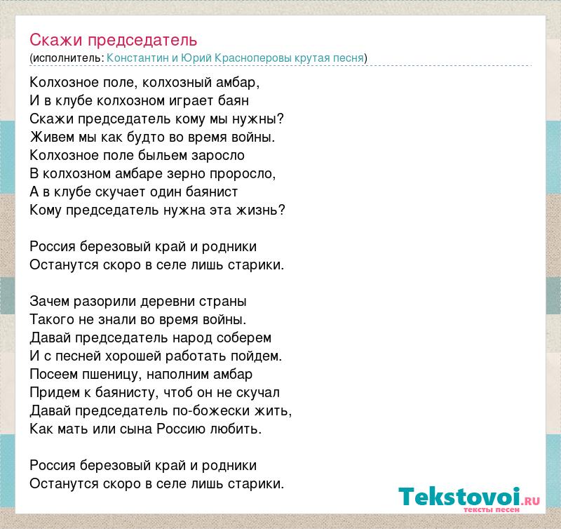 Колхозное поле, колхозный амбар, И в клубе колхозном играет баян Скажи председатель кому мы нужны? Живем мы как будто во время войны. Колхозное поле быльем заросло В колхозном амбаре зерно проросло, А в клубе скучает один баянист Кому председатель нужна эта жизнь? Россия березовый край и родники Останутся скоро в селе лишь старики. Зачем разорили деревни страны Такого не знали во время войны. Давай председатель народ соберем И с песней хорошей работать пойдем. Посеем пшеницу, наполним амбар Придем к баянисту, чтоб он не скучал Давай председатель по-божески жить, Как мать или сына Россию любить. Россия березовый край и родники Останутся скоро в селе лишь старики.