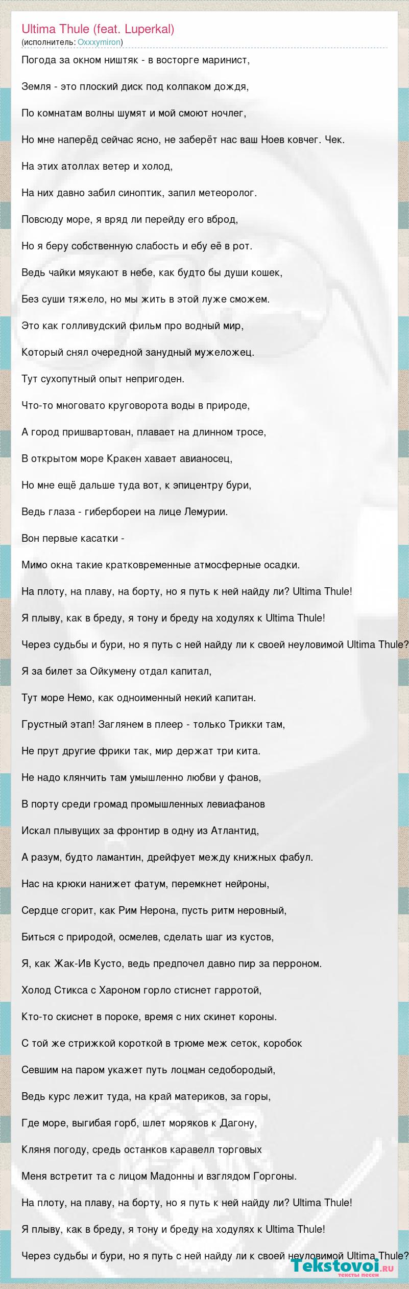 Погода за окном ништяк - в восторге маринист, Земля - это плоский диск под колпаком дождя, По комнатам волны шумят и мой смоют ночлег, Но мне наперёд сейчас ясно, не заберёт нас ваш Ноев ковчег. Чек. На этих атоллах ветер и холод, На них давно забил синоптик, запил метеоролог. Повсюду море, я вряд ли перейду его вброд, Но я беру собственную слабость и ебу её в рот. Ведь чайки мяукают в небе, как будто бы души кошек, Без суши тяжело, но мы жить в этой луже сможем. Это как голливудский фильм про водный мир, Который снял очередной занудный мужеложец. Тут сухопутный опыт непригоден. Что-то многовато круговорота воды в природе, А город пришвартован, плавает на длинном тросе, В открытом море Кракен хавает авианосец, Но мне ещё дальше туда вот, к эпицентру бури, Ведь глаза - гибербореи на лице Лемурии. Вон первые касатки - Мимо окна такие кратковременные атмосферные осадки. На плоту, на плаву, на борту, но я путь к ней найду ли? Ultima Thule! Я плыву, как в бреду, я тону и бреду на ходулях к Ultima Thule! Через судьбы и бури, но я путь с ней найду ли к своей неуловимой Ultima Thule? Я за билет за Ойкумену отдал капитал, Тут море Немо, как одноименный некий капитан. Грустный этап! Заглянем в плеер - только Трикки там, Не прут другие фрики так, мир держат три кита. Не надо клянчить там умышленно любви у фанов, В порту среди громад промышленных левиафанов Искал плывущих за фронтир в одну из Атлантид, А разум, будто ламантин, дрейфует между книжных фабул. Нас на крюки нанижет фатум, перемкнет нейроны, Сердце сгорит, как Рим Нерона, пусть ритм неровный, Биться с природой, осмелев, сделать шаг из кустов, Я, как Жак-Ив Кусто, ведь предпочел давно пир за перроном. Холод Стикса с Хароном горло стиснет гарротой, Кто-то скиснет в пороке, время с них скинет короны. С той же стрижкой короткой в трюме меж сеток, коробок Севшим на паром укажет путь лоцман седобородый, Ведь курс лежит туда, на край материков, за горы, Где море, выгибая горб, шлет моряков к Дагону, Кляня погоду, средь останков каравелл торговых Меня встретит та с лицом Мадонны и взглядом Горгоны. На плоту, на плаву, на борту, но я путь к ней найду ли? Ultima Thule! Я плыву, как в бреду, я тону и бреду на ходулях к Ultima Thule! Через судьбы и бури, но я путь с ней найду ли к своей неуловимой Ultima Thule?