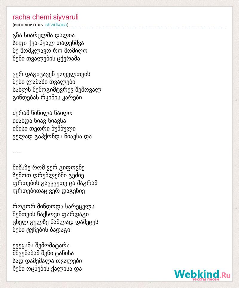 გზა სიარულმა დალია სიფი ქვა-წყალ თადენმვა მე მომკლავო რო მომიღო შენი თვალების ცქერამა ვერ დაგიცავენ ყოველთვის შენი ლამაზი თვალები სახლს შემოგიმტვრევ შემოვალ გინდებას რკინის კარები ძერამ წიწილა წაიღო იძახდა წიავ-წიავსა იმისი თეთრი ბუმბული ველად გაჰქონდა ნიავსა და ---- მიწაზე რომ ვერ გიფოვნე ზემოთ ღრუბლებში გეძიე ფრთების გავკვეთე ცა მაგრამ ფრთებითაც ვერ დაგეწიე როგორ მინდოდა სარეცელს შენთვის ნაქსოვი ფარდაგი ცხელ გულზე წამლად დამეცეს შენი ტუჩების ბადაგი ქვეყანა შემომატარა მშვენაბამ შენი ტანისა სად დამემალა თვალები ჩემი ოცნების ქალისა და
