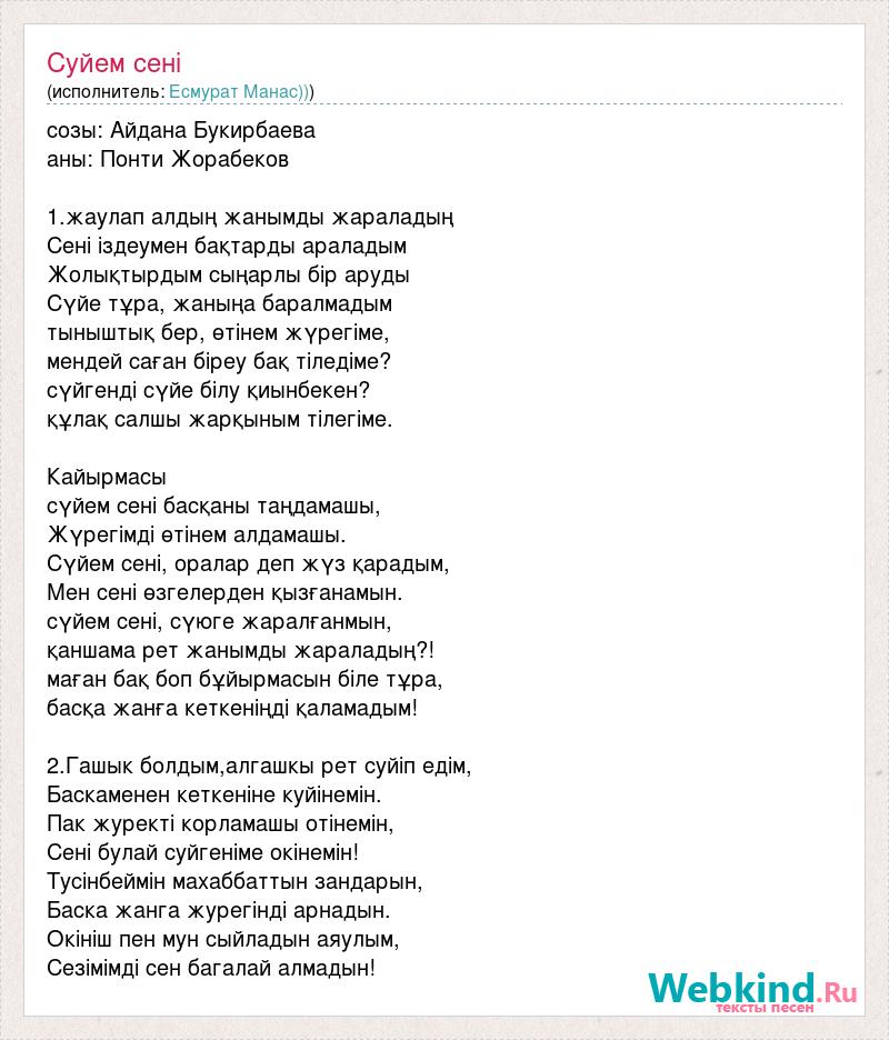 созы: Айдана Букирбаева аны: Понти Жорабеков 1.жаулап алдың жанымды жараладың Сені іздеумен бақтарды араладым Жолықтырдым сыңарлы бір аруды Сүйе тұра, жаныңа баралмадым тыныштық бер, өтінем жүрегіме, мендей саған біреу бақ тіледіме? сүйгенді сүйе білу қиынбекен? құлақ салшы жарқыным тілегіме. Кайырмасы сүйем сені басқаны таңдамашы, Жүрегімді өтінем алдамашы. Сүйем сені, оралар деп жүз қарадым, Мен сені өзгелерден қызғанамын. сүйем сені, сүюге жаралғанмын, қаншама рет жанымды жараладың?! маған бақ боп бұйырмасын біле тұра, басқа жанға кеткеніңді қаламадым! 2.Гашык болдым,алгашкы рет суйiп едім, Баскаменен кеткенiне куйiнемін. Пак журектi корламашы отiнемін, Сенi булай суйгенiме окiнемін! Тусiнбеймiн махаббаттын зандарын, Баска жанга журегiндi арнадын. Окiнiш пен мун сыйладын аяулым, Сезiмiмдi сен багалай алмадын!