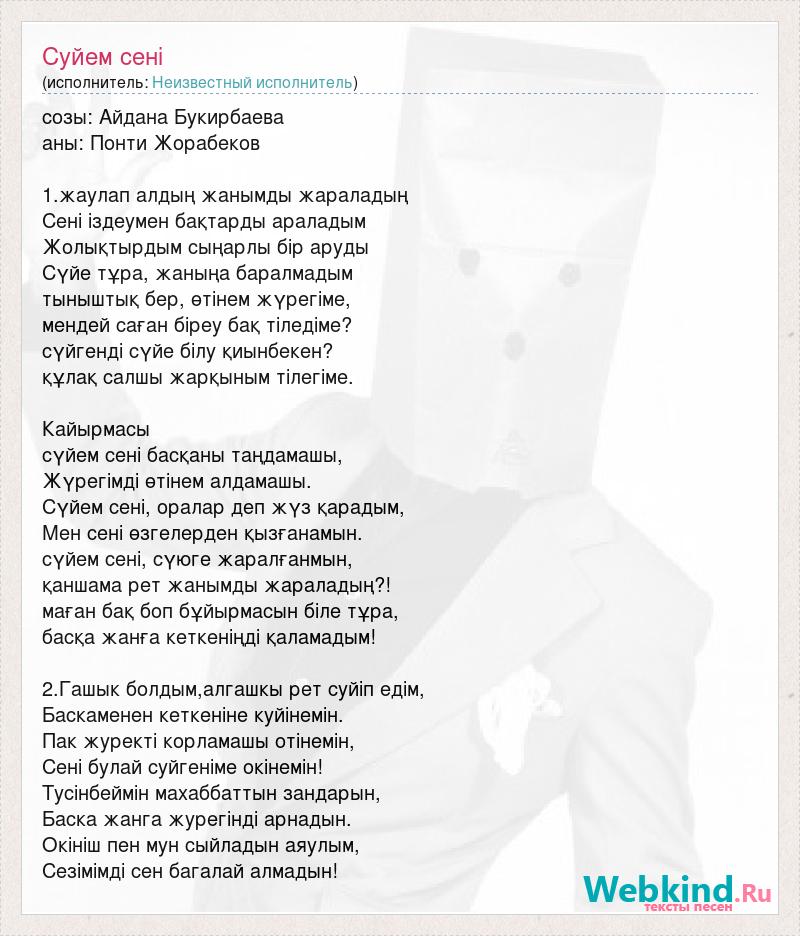 созы: Айдана Букирбаева аны: Понти Жорабеков 1.жаулап алдың жанымды жараладың Сені іздеумен бақтарды араладым Жолықтырдым сыңарлы бір аруды Сүйе тұра, жаныңа баралмадым тыныштық бер, өтінем жүрегіме, мендей саған біреу бақ тіледіме? сүйгенді сүйе білу қиынбекен? құлақ салшы жарқыным тілегіме. Кайырмасы сүйем сені басқаны таңдамашы, Жүрегімді өтінем алдамашы. Сүйем сені, оралар деп жүз қарадым, Мен сені өзгелерден қызғанамын. сүйем сені, сүюге жаралғанмын, қаншама рет жанымды жараладың?! маған бақ боп бұйырмасын біле тұра, басқа жанға кеткеніңді қаламадым! 2.Гашык болдым,алгашкы рет суйiп едім, Баскаменен кеткенiне куйiнемін. Пак журектi корламашы отiнемін, Сенi булай суйгенiме окiнемін! Тусiнбеймiн махаббаттын зандарын, Баска жанга журегiндi арнадын. Окiнiш пен мун сыйладын аяулым, Сезiмiмдi сен багалай алмадын!