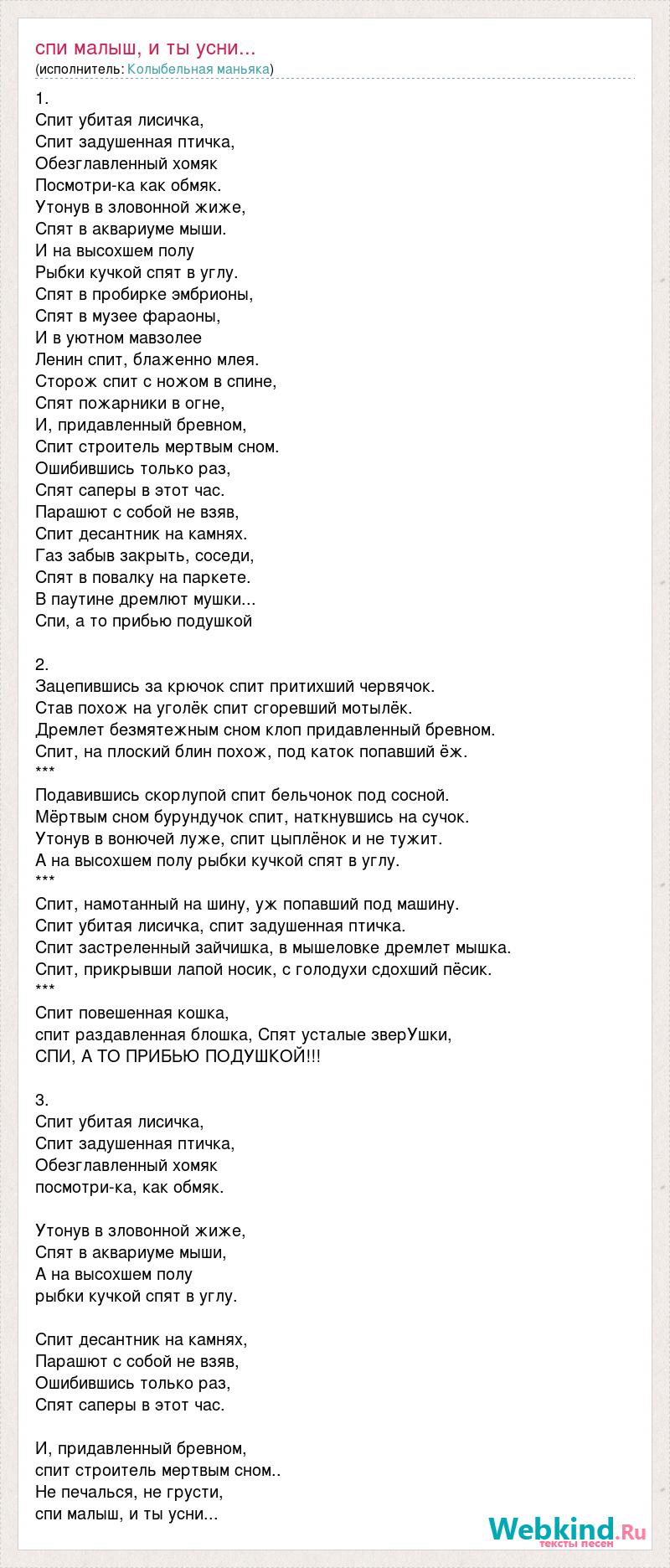 1. Спит убитая лисичка, Спит задушенная птичка, Обезглавленный хомяк Посмотри-ка как обмяк. Утонув в зловонной жиже, Спят в аквариуме мыши. И на высохшем полу Рыбки кучкой спят в углу. Спят в пробирке эмбрионы, Спят в музее фараоны, И в уютном мавзолее Ленин спит, блаженно млея. Сторож спит с ножом в спине, Спят пожарники в огне, И, придавленный бревном, Спит строитель мертвым сном. Ошибившись только раз, Спят саперы в этот час. Парашют с собой не взяв, Спит десантник на камнях. Газ забыв закрыть, соседи, Спят в повалку на паркете. В паутине дремлют мушки... Спи, а то прибью подушкой 2. Зацепившись за крючок спит притихший червячок. Став похож на уголёк спит сгоревший мотылёк. Дремлет безмятежным сном клоп придавленный бревном. Спит, на плоский блин похож, под каток попавший ёж. *** Подавившись скорлупой спит бельчонок под сосной. Мёртвым сном бурундучок спит, наткнувшись на сучок. Утонув в вонючей луже, спит цыплёнок и не тужит. А на высохшем полу рыбки кучкой спят в углу. *** Спит, намотанный на шину, уж попавший под машину. Спит убитая лисичка, спит задушенная птичка. Спит застреленный зайчишка, в мышеловке дремлет мышка. Спит, прикрывши лапой носик, с голодухи сдохший пёсик. *** Спит повешенная кошка, спит раздавленная блошка, Спят усталые зверУшки, СПИ, А ТО ПРИБЬЮ ПОДУШКОЙ!!! 3. Спит убитая лисичка, Спит задушенная птичка, Обезглавленный хомяк посмотри-ка, как обмяк. Утонув в зловонной жиже, Спят в аквариуме мыши, А на высохшем полу рыбки кучкой спят в углу. Спит десантник на камнях, Парашют с собой не взяв, Ошибившись только раз, Спят саперы в этот час. И, придавленный бревном, спит строитель мертвым сном.. Не печалься, не грусти, спи малыш, и ты усни...