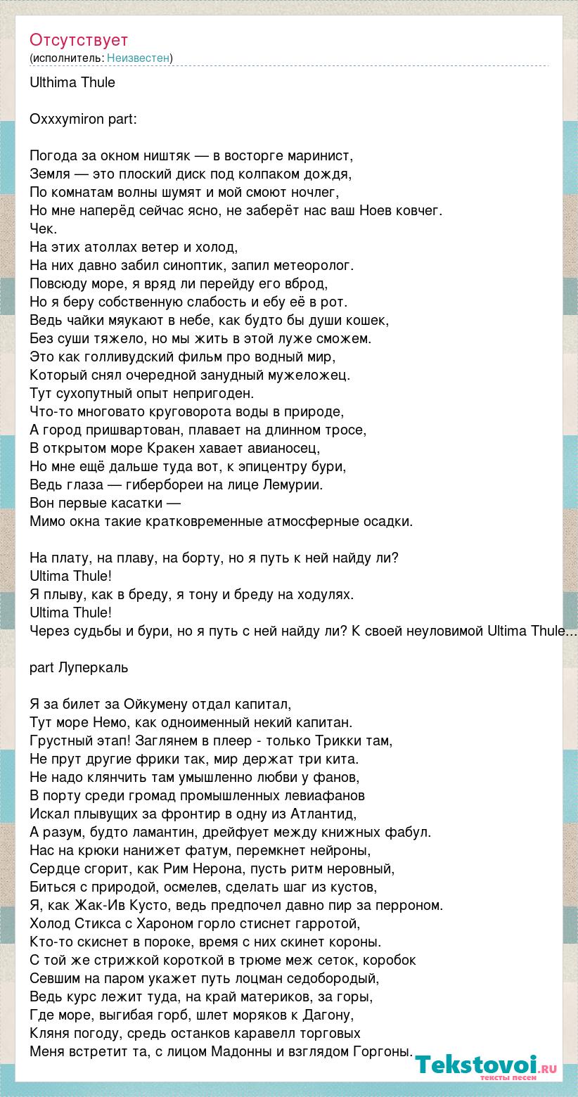 Ulthima Thule Oxxxymiron part: Погода за окном ништяк — в восторге маринист, Земля — это плоский диск под колпаком дождя, По комнатам волны шумят и мой смоют ночлег, Но мне наперёд сейчас ясно, не заберёт нас ваш Ноев ковчег. Чек. На этих атоллах ветер и холод, На них давно забил синоптик, запил метеоролог. Повсюду море, я вряд ли перейду его вброд, Но я беру собственную слабость и ебу её в рот. Ведь чайки мяукают в небе, как будто бы души кошек, Без суши тяжело, но мы жить в этой луже сможем. Это как голливудский фильм про водный мир, Который снял очередной занудный мужеложец. Тут сухопутный опыт непригоден. Что-то многовато круговорота воды в природе, А город пришвартован, плавает на длинном тросе, В открытом море Кракен хавает авианосец, Но мне ещё дальше туда вот, к эпицентру бури, Ведь глаза — гибербореи на лице Лемурии. Вон первые касатки — Мимо окна такие кратковременные атмосферные осадки. На плату, на плаву, на борту, но я путь к ней найду ли? Ultima Thule! Я плыву, как в бреду, я тону и бреду на ходулях. Ultima Thule! Через судьбы и бури, но я путь с ней найду ли? К своей неуловимой Ultima Thule... part Луперкаль Я за билет за Ойкумену отдал капитал, Тут море Немо, как одноименный некий капитан. Грустный этап! Заглянем в плеер - только Трикки там, Не прут другие фрики так, мир держат три кита. Не надо клянчить там умышленно любви у фанов, В порту среди громад промышленных левиафанов Искал плывущих за фронтир в одну из Атлантид, А разум, будто ламантин, дрейфует между книжных фабул. Нас на крюки нанижет фатум, перемкнет нейроны, Сердце сгорит, как Рим Нерона, пусть ритм неровный, Биться с природой, осмелев, сделать шаг из кустов, Я, как Жак-Ив Кусто, ведь предпочел давно пир за перроном. Холод Стикса с Хароном горло стиснет гарротой, Кто-то скиснет в пороке, время с них скинет короны. С той же стрижкой короткой в трюме меж сеток, коробок Севшим на паром укажет путь лоцман седобородый, Ведь курс лежит туда, на край материков, за горы, Где море, выгибая горб, шлет моряков к Дагону, Кляня погоду, средь останков каравелл торговых Меня встретит та, с лицом Мадонны и взглядом Горгоны.