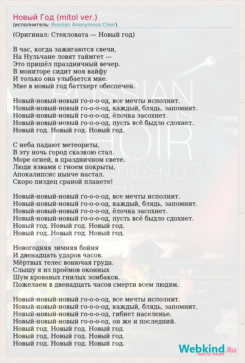 (Оригинал: Стекловата — Новый год) В час, когда зажигаются свечи, На Нульчане ловят таймгет — Это пришёл праздничный вечер. В мониторе сидит моя вайфу И только она улыбается мне. Мне в новый год баттхерт обеспечен. Новый-новый-новый го-о-о-од, все мечты исполнит. Новый-новый-новый го-о-о-од, каждый, блядь, запомнит. Новый-новый-новый го-о-о-од, ёлочка засохнет. Новый-новый-новый го-о-о-од, пусть всё быдло сдохнет. Новый год. Новый год. Новый год. С неба падают метеориты, В эту ночь город сказкою стал. Море огней, в праздничном свете. Люди язвами с гноем покрыты, Апокалипсис нынче настал. Скоро пиздец сраной планете! Новый-новый-новый го-о-о-од, все мечты исполнит. Новый-новый-новый го-о-о-од, каждый, блядь, запомнит. Новый-новый-новый го-о-о-од, ёлочка засохнет. Новый-новый-новый го-о-о-од, пусть всё быдло сдохнет. Новый год. Новый год. Новый год. Новый год. Новый год. Новый год. Новогодняя зимняя бойня И двенадцать ударов часов. Мёртвых телес вонючая груда. Слышу я из проёмов оконных Шум кровавых гнилых зомбаков. Пожелаем в двенадцать часов смерти всем людям. Новый-новый-новый го-о-о-од, все мечты исполнит. Новый-новый-новый го-о-о-од, каждый, блядь, запомнит. Новый-новый-новый го-о-о-од, гибнет населенье. Новый-новый-новый го-о-о-од, он же и последний. Новый год. Новый год. Новый год. Новый год. Новый год. Новый год. Новый год. Новый год. Новый год.