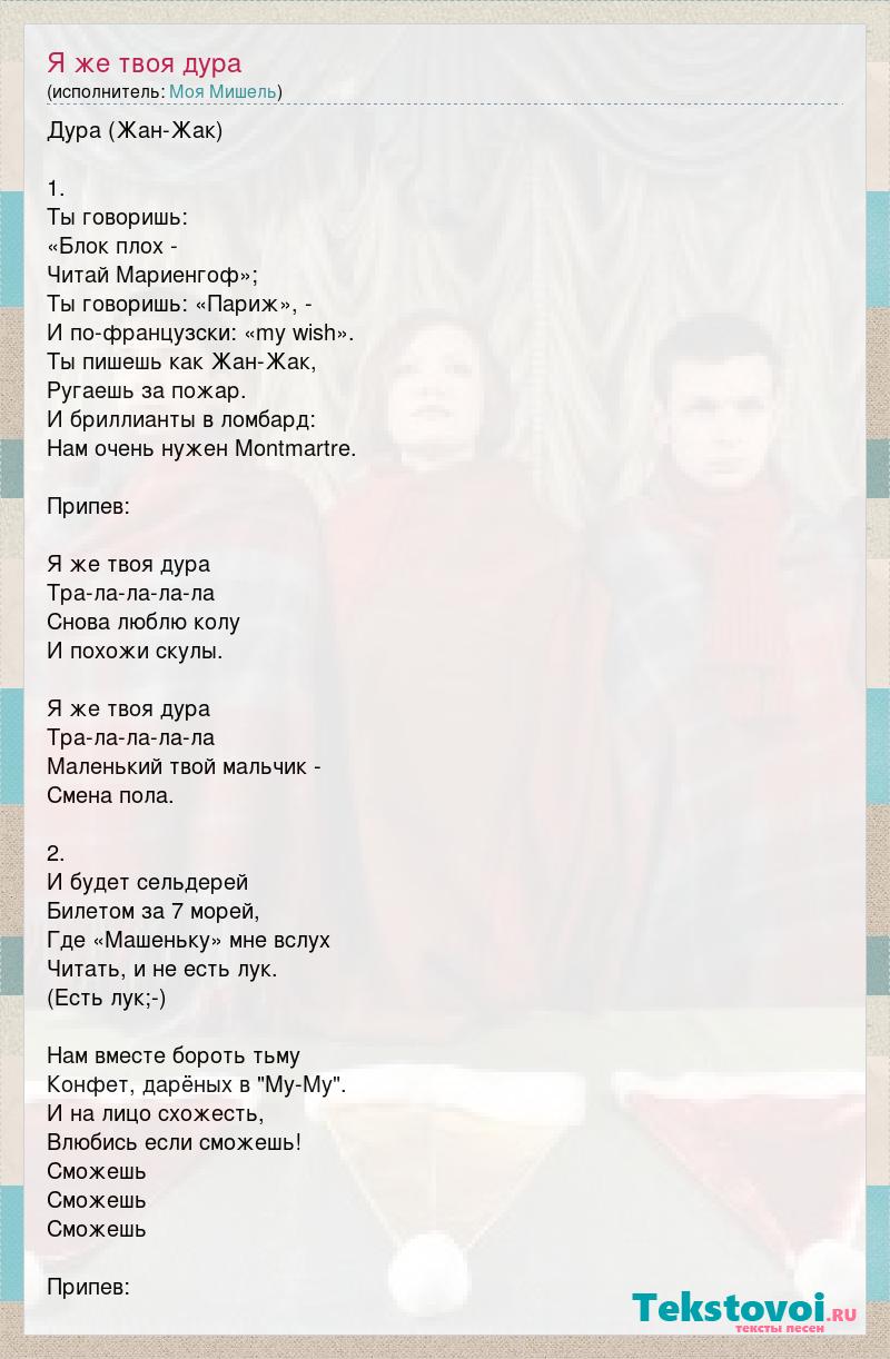 Дура (Жан-Жак) 1. Ты говоришь: «Блок плох - Читай Мариенгоф»; Ты говоришь: «Париж», - И по-французски: «my wish». Ты пишешь как Жан-Жак, Ругаешь за пожар. И бриллианты в ломбард: Нам очень нужен Montmartre. Припев: Я же твоя дура Тра-ла-ла-ла-ла Снова люблю колу И похожи скулы. Я же твоя дура Тра-ла-ла-ла-ла Маленький твой мальчик - Смена пола. 2. И будет сельдерей Билетом за 7 морей, Где «Машеньку» мне вслух Читать, и не есть лук. (Есть лук;-) Нам вместе бороть тьму Конфет, дарёных в "Му-Му". И на лицо схожесть, Влюбись если сможешь! Сможешь Сможешь Сможешь Припев: