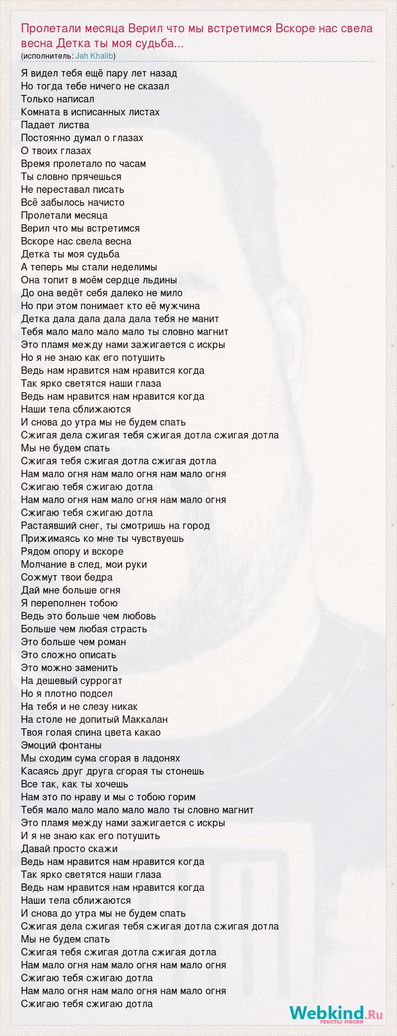 Главная→Исполнители→Jah Khalib→Пролетали месяца Верил что мы встретимся Вскоре нас свела весна Детка ты мо
