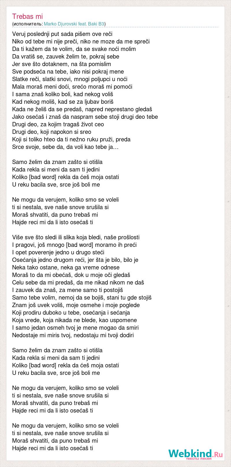 Veruj poslednji put sada pišem ove reči Niko od tebe mi nije preči, niko ne moze da me spreči Da ti kažem da te volim, da se svake noći molim Da vratiš se, zauvek želim te, pokraj sebe Jer sve što dotaknem, na šta pomislim Sve podseća na tebe, iako nisi pokraj mene Slatke reči, slatki snovi, mnogi poljupci u noći Mala moraš meni doći, srećo moraš mi pomoći I sama znaš koliko boli, kad nekog voliš Kad nekog moliš, kad se za ljubav boriš Kada ne želiš da se predaš, napred neprestano gledaš Jako osećaš i znaš da naspram sebe stoji drugi deo tebe Drugi deo, za kojim tragaš život ceo Drugi deo, koji napokon si sreo Koji si toliko hteo da ti nežno ruku pruži, preda Srce svoje, sebe da, da voli kao tebe ja… Samo želim da znam zašto si otišla Kada rekla si meni da sam ti jedini Koliko [bad word] rekla da ćeš moja ostati U reku bacila sve, srce još boli me Ne mogu da verujem, koliko smo se voleli ti si nestala, sve naše snove srušila si Moraš shvatiti, da puno trebaš mi Hajde reci mi da li isto osećaš ti Više sve što sledi ili slika koja bledi, naše prošlosti I pragovi, još mnogo [bad word] moramo ih preći I opet poverenje jedno u drugo steći Osećanja jedno drugom reći, jer šta je bilo, bilo je Neka tako ostane, neka ga vreme odnese Moraš to da mi obećaš, dok u moje oči gledaš Celu sebe da mi predaš, da me nikad nikom ne daš I zauvek da znaš, za mene samo ti postojiš Samo tebe volim, nemoj da se bojiš, stani tu gde stojiš Znam još uvek voliš, moje osmehe i moje poglede Koji prodiru duboko u tebe, osećanja i sećanja Koja vrede, koja nikada ne blede, kao uspomene I samo jedan osmeh tvoj je mene mogao da smiri Nedostaje mi miris tvoj, nedostaju mi tvoji dodiri Samo želim da znam zašto si otišla Kada rekla si meni da sam ti jedini Koliko [bad word] rekla da ćeš moja ostati U reku bacila sve, srce još boli me Ne mogu da verujem, koliko smo se voleli ti si nestala, sve naše snove srušila si Moraš shvatiti, da puno trebaš mi Hajde reci mi da li isto osećaš ti Ne mogu da verujem, koliko smo se voleli ti si nestala, sve naše snove srušila si Moraš shvatiti, da puno trebaš mi Hajde reci mi da li isto osećaš ti