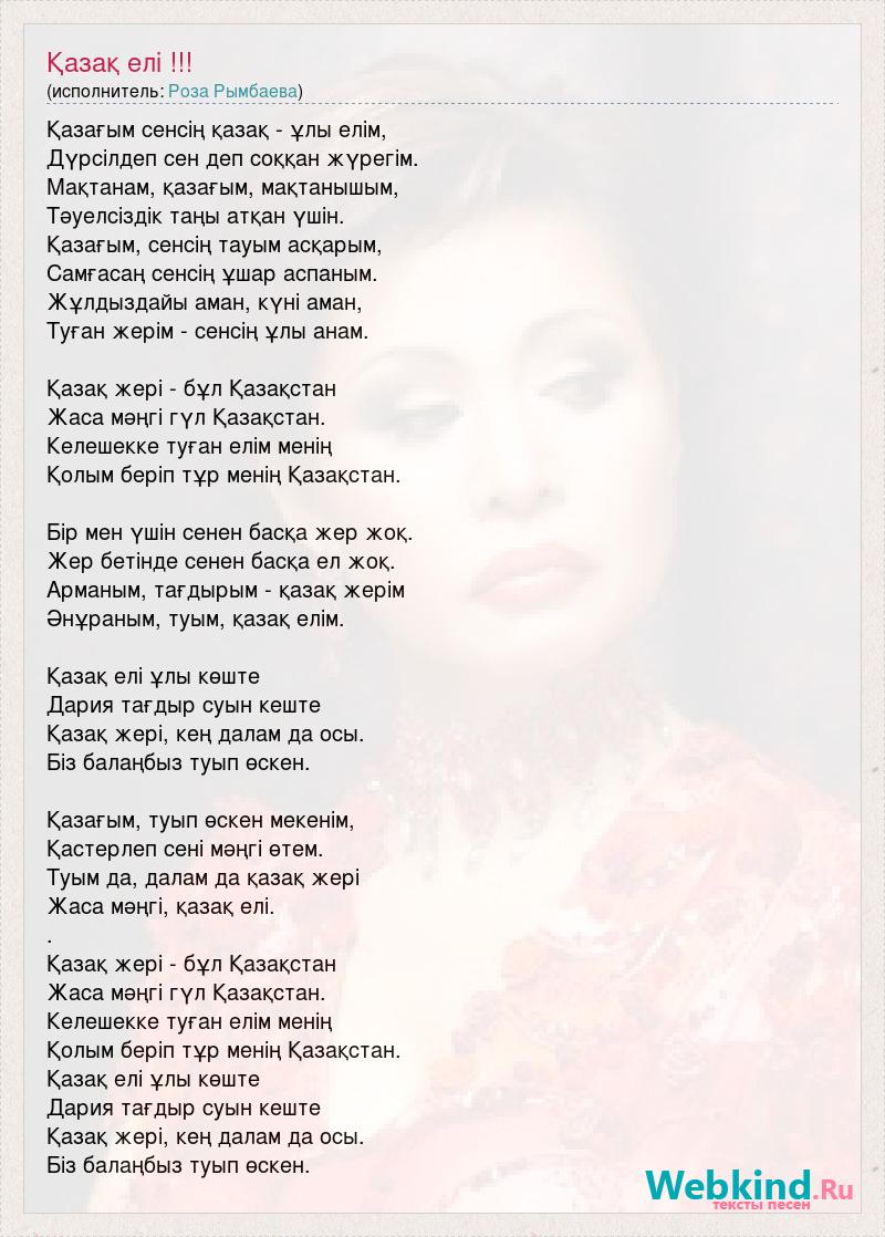 Қазағым сенсің қазақ - ұлы елім, Дүрсілдеп сен деп соққан жүрегім. Мақтанам, қазағым, мақтанышым, Тәуелсіздік таңы атқан үшін. Қазағым, сенсің тауым асқарым, Самғасаң сенсің ұшар аспаным. Жұлдыздайы аман, күні аман, Туған жерім - сенсің ұлы анам. Қазақ жері - бұл Қазақстан Жаса мәңгі гүл Қазақстан. Келешекке туған елім менің Қолым беріп тұр менің Қазақстан. Бір мен үшін сенен басқа жер жоқ. Жер бетінде сенен басқа ел жоқ. Арманым, тағдырым - қазақ жерім Әнұраным, туым, қазақ елім. Қазақ елі ұлы көште Дария тағдыр суын кеште Қазақ жері, кең далам да осы. Біз балаңбыз туып өскен. Қазағым, туып өскен мекенім, Қастерлеп сені мәңгі өтем. Туым да, далам да қазақ жері Жаса мәңгі, қазақ елі. . Қазақ жері - бұл Қазақстан Жаса мәңгі гүл Қазақстан. Келешекке туған елім менің Қолым беріп тұр менің Қазақстан. Қазақ елі ұлы көште Дария тағдыр суын кеште Қазақ жері, кең далам да осы. Біз балаңбыз туып өскен.