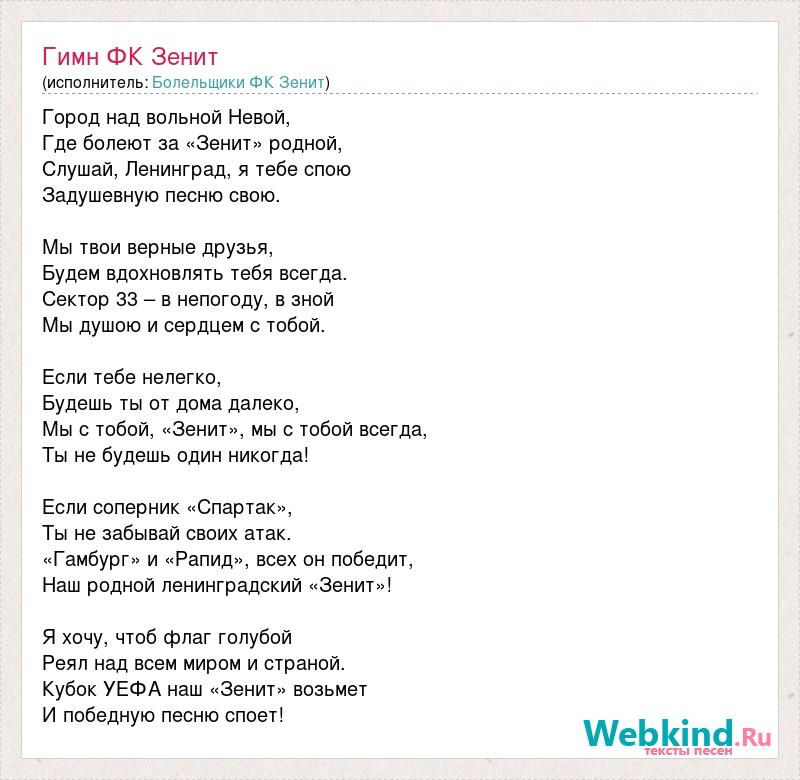Город над вольной Невой, Где болеют за «Зенит» родной, Слушай, Ленинград, я тебе спою Задушевную песню свою. Мы твои верные друзья, Будем вдохновлять тебя всегда. Сектор 33 – в непогоду, в зной Мы душою и сердцем с тобой. Если тебе нелегко, Будешь ты от дома далеко, Мы с тобой, «Зенит», мы с тобой всегда, Ты не будешь один никогда! Если соперник «Спартак», Ты не забывай своих атак. «Гамбург» и «Рапид», всех он победит, Наш родной ленинградский «Зенит»! Я хочу, чтоб флаг голубой Реял над всем миром и страной. Кубок УЕФА наш «Зенит» возьмет И победную песню споет!
