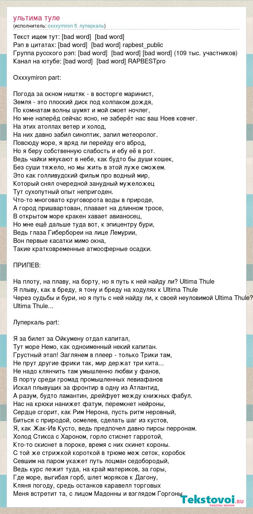 Текст ищем тут: [bad word] [bad word] Рэп в цитатах: [bad word] [bad word] rapbest_public Группа русского рэп: [bad word] [bad word] rapbestru (109 тыс. участников) Канал на ютубе: [bad word] [bad word] RAPBESTpro Oxxxymiron part: Погода за окном ништяк - в восторге маринист, Земля - это плоский диск под колпаком дождя, По комнатам волны шумят и мой смоет ночлег, Но мне наперёд сейчас ясно, не заберёт нас ваш Ноев ковчег. На этих атоллах ветер и холод, На них давно забил синоптик, запил метеоролог. Повсюду море, я вряд ли перейду его вброд, Но я беру собственную слабость и ебу её в рот. Ведь чайки мяукают в небе, как будто бы души кошек, Без суши тяжело, но мы жить в этой луже сможем. Это как голливудский фильм про водный мир, Который снял очередной занудный мужеложец Тут сухопутный опыт непригоден. Что-то многовато круговорота воды в природе, А город пришвартован, плавает на длинном тросе, В открытом море кракен хавает авианосец, Но мне ещё дальше туда вот, к эпицентру бури, Ведь глаза Гибербореи на лице Лемурии, Вон первые касатки мимо окна, Такие кратковременные атмосферные осадки. ПРИПЕВ: На плоту, на плаву, на борту, но я путь к ней найду ли? Ultima Thule Я плыву, как в бреду, я тону и бреду на ходулях к Ultima Thule Через судьбы и бури, но я путь с ней найду ли, к своей неуловимой Ultima Thule? Ultima Thule... Луперкаль part: Я за билет за Ойкумену отдал капитал, Тут море Немо, как одноименный некий капитан. Грустный этап! Заглянем в плеер - только Трики там, Не прут другие фрики так, мир держат три кита... Не надо клянчить там умышленно любви у фанов, В порту среди громад промышленных левиафанов Искал плывущих за фронтир в одну из Атлантид, А разум, будто ламантин, дрейфует между книжных фабул. Нас на крюки нанижет фатум, перемкнет нейроны, Сердце сгорит, как Рим Нерона, пусть ритм неровный, Биться с природой, осмелев, сделать шаг из кустов, Я, как Жак-Ив Кусто, ведь предпочел давно пирсы перронам. Холод Стикса с Хароном, горло стиснет гарротой, Кто-то скиснет в пороке, время с них скинет короны. С той же стрижкой короткой в трюме меж сеток, коробок Севшим на паром укажет путь лоцман седобородый, Ведь курс лежит туда, на край материков, за горы, Где море, выгибая горб, шлет моряков к Дагону, Кляня погоду, средь останков каравелл торговых Меня встретит та, с лицом Мадонны и взглядом Горгоны