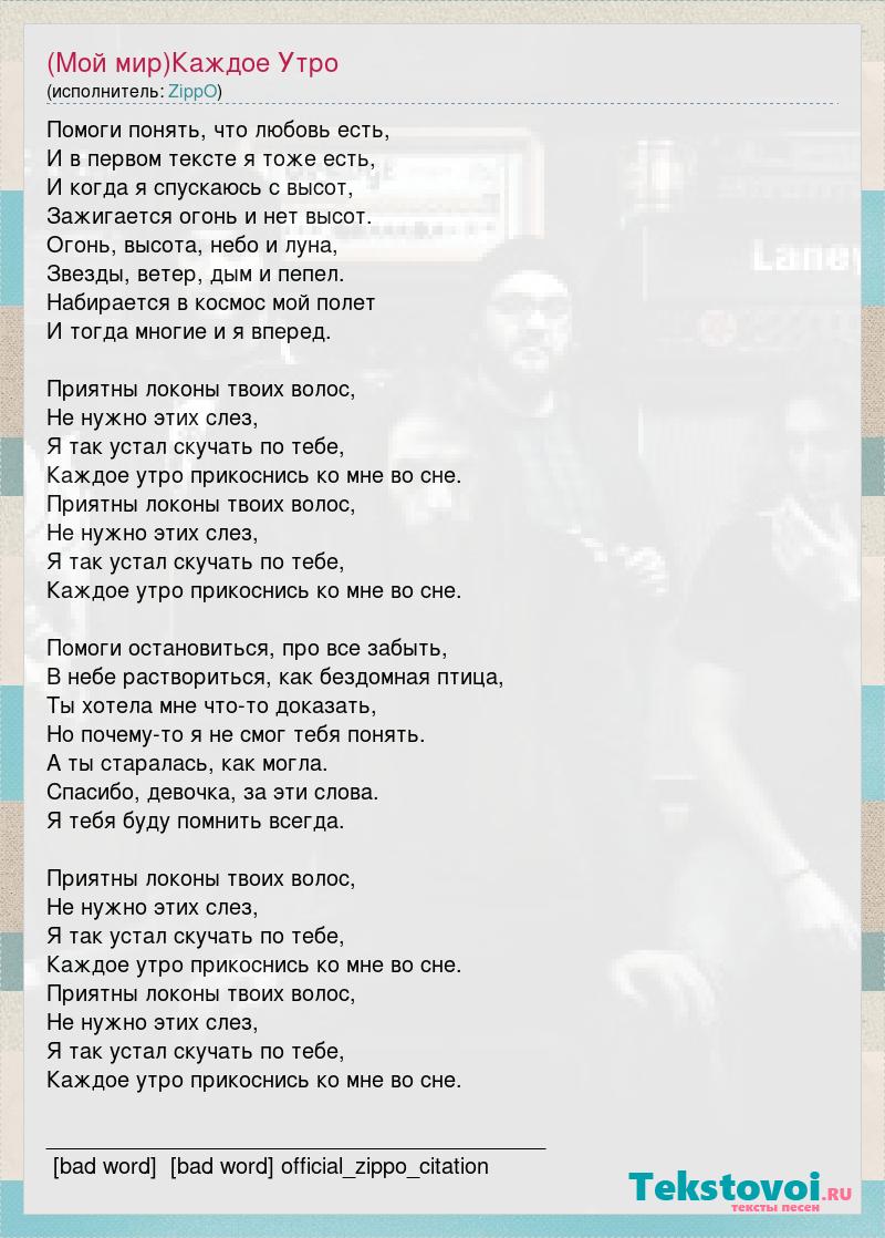 Помоги понять, что любовь есть, И в первом тексте я тоже есть, И когда я спускаюсь с высот, Зажигается огонь и нет высот. Огонь, высота, небо и луна, Звезды, ветер, дым и пепел. Набирается в космос мой полет И тогда многие и я вперед. Приятны локоны твоих волос, Не нужно этих слез, Я так устал скучать по тебе, Каждое утро прикоснись ко мне во сне. Приятны локоны твоих волос, Не нужно этих слез, Я так устал скучать по тебе, Каждое утро прикоснись ко мне во сне. Помоги остановиться, про все забыть, В небе раствориться, как бездомная птица, Ты хотела мне что-то доказать, Но почему-то я не смог тебя понять. А ты старалась, как могла. Спасибо, девочка, за эти слова. Я тебя буду помнить всегда. Приятны локоны твоих волос, Не нужно этих слез, Я так устал скучать по тебе, Каждое утро прикоснись ко мне во сне. Приятны локоны твоих волос, Не нужно этих слез, Я так устал скучать по тебе, Каждое утро прикоснись ко мне во сне. _________________________________________ [bad word] [bad word] official_zippo_citation