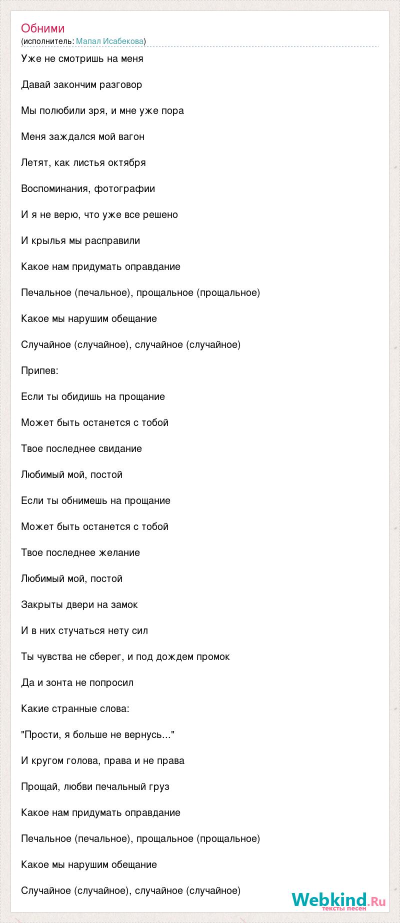 Уже не смотришь на меня Давай закончим разговор Мы полюбили зря, и мне уже пора Меня заждался мой вагон Летят, как листья октября Воспоминания, фотографии И я не верю, что уже все решено И крылья мы расправили Какое нам придумать оправдание Печальное (печальное), прощальное (прощальное) Какое мы нарушим обещание Случайное (случайное), случайное (случайное) Припев: Если ты обидишь на прощание Может быть останется с тобой Твое последнее свидание Любимый мой, постой Если ты обнимешь на прощание Может быть останется с тобой Твое последнее желание Любимый мой, постой Закрыты двери на замок И в них стучаться нету сил Ты чувства не сберег, и под дождем промок Да и зонта не попросил Какие странные слова: "Прости, я больше не вернусь..." И кругом голова, права и не права Прощай, любви печальный груз Какое нам придумать оправдание Печальное (печальное), прощальное (прощальное) Какое мы нарушим обещание Случайное (случайное), случайное (случайное)