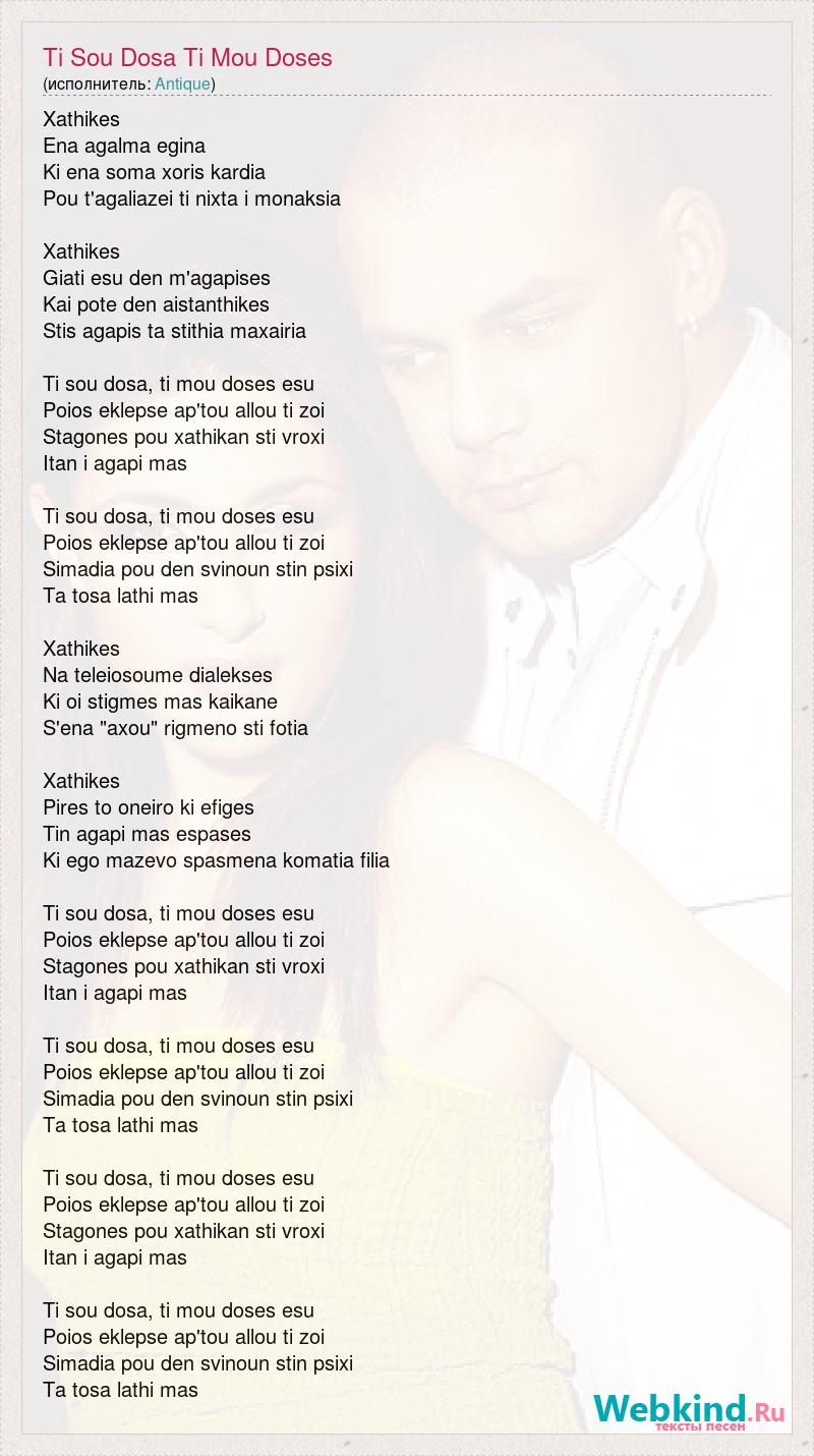 Xathikes Ena agalma egina Ki ena soma xoris kardia Pou t'agaliazei ti nixta i monaksia Xathikes Giati esu den m'agapises Kai pote den aistanthikes Stis agapis ta stithia maxairia Ti sou dosa, ti mou doses esu Poios eklepse ap'tou allou ti zoi Stagones pou xathikan sti vroxi Itan i agapi mas Ti sou dosa, ti mou doses esu Poios eklepse ap'tou allou ti zoi Simadia pou den svinoun stin psixi Ta tosa lathi mas Xathikes Na teleiosoume dialekses Ki oi stigmes mas kaikane S'ena "axou" rigmeno sti fotia Xathikes Pires to oneiro ki efiges Tin agapi mas espases Ki ego mazevo spasmena komatia filia Ti sou dosa, ti mou doses esu Poios eklepse ap'tou allou ti zoi Stagones pou xathikan sti vroxi Itan i agapi mas Ti sou dosa, ti mou doses esu Poios eklepse ap'tou allou ti zoi Simadia pou den svinoun stin psixi Ta tosa lathi mas Ti sou dosa, ti mou doses esu Poios eklepse ap'tou allou ti zoi Stagones pou xathikan sti vroxi Itan i agapi mas Ti sou dosa, ti mou doses esu Poios eklepse ap'tou allou ti zoi Simadia pou den svinoun stin psixi Ta tosa lathi mas