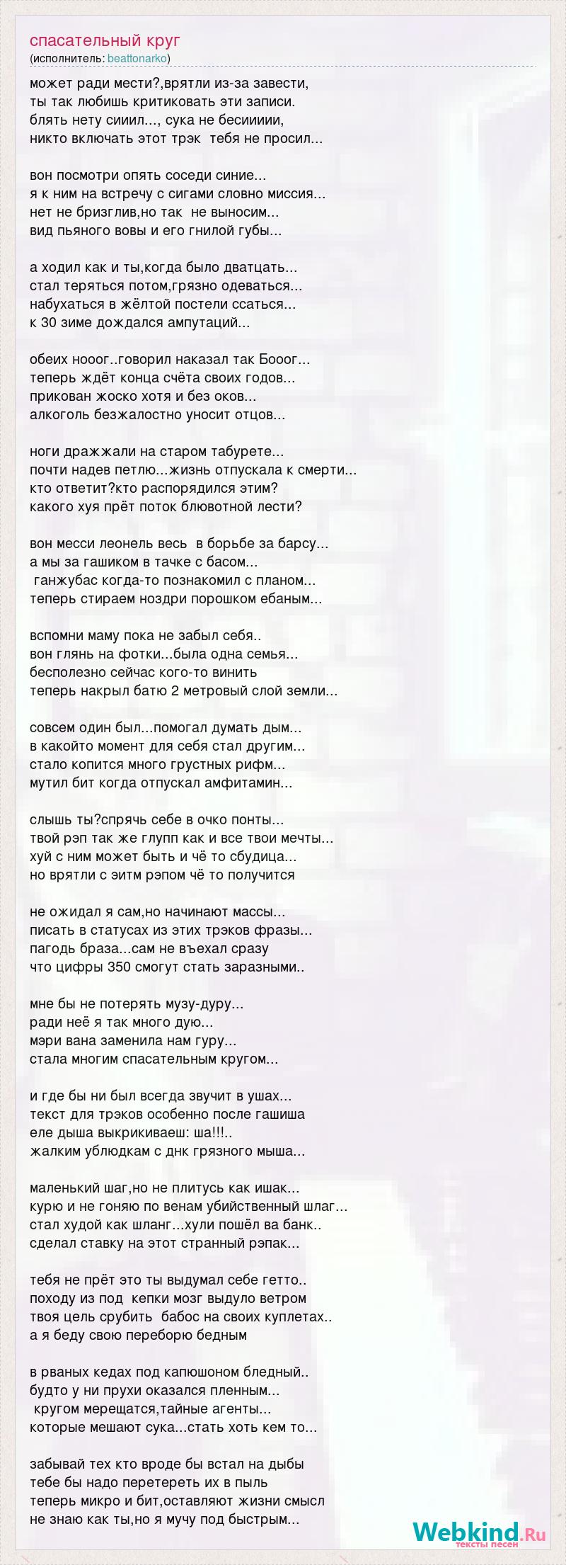 может ради мести?,врятли из-за завести, ты так любишь критиковать эти записи. блять нету сииил..., сука не бесиииии, никто включать этот трэк тебя не просил... вон посмотри опять соседи синие... я к ним на встречу с сигами словно миссия... нет не бризглив,но так не выносим... вид пьяного вовы и его гнилой губы... а ходил как и ты,когда было дватцать... стал теряться потом,грязно одеваться... набухаться в жёлтой постели ссаться... к 30 зиме дождался ампутаций... обеих нооог..говорил наказал так Бооог... теперь ждёт конца счёта своих годов... прикован жоско хотя и без оков... алкоголь безжалостно уносит отцов... ноги дражжали на старом табурете... почти надев петлю...жизнь отпускала к смерти... кто ответит?кто распорядился этим? какого хуя прёт поток блювотной лести? вон месси леонель весь в борьбе за барсу... а мы за гашиком в тачке с басом... ганжубас когда-то познакомил с планом... теперь стираем ноздри порошком ебаным... вспомни маму пока не забыл себя.. вон глянь на фотки...была одна семья... бесполезно сейчас кого-то винить теперь накрыл батю 2 метровый слой земли... совсем один был...помогал думать дым... в какойто момент для себя стал другим... стало копится много грустных рифм... мутил бит когда отпускал амфитамин... слышь ты?спрячь себе в очко понты... твой рэп так же глупп как и все твои мечты... хуй с ним может быть и чё то сбудица... но врятли с эитм рэпом чё то получится не ожидал я сам,но начинают массы... писать в статусах из этих трэков фразы... пагодь браза...сам не въехал сразу что цифры 350 смогут стать заразными.. мне бы не потерять музу-дуру... ради неё я так много дую... мэри вана заменила нам гуру... стала многим спасательным кругом... и где бы ни был всегда звучит в ушах... текст для трэков особенно после гашиша еле дыша выкрикиваеш: ша!!!.. жалким ублюдкам с днк грязного мыша... маленький шаг,но не плитусь как ишак... курю и не гоняю по венам убийственный шлаг... стал худой как шланг...хули пошёл ва банк.. сделал ставку на этот странный рэпак... тебя не прёт это ты выдумал себе гетто.. походу из под кепки мозг выдуло ветром твоя цель срубить бабос на своих куплетах.. а я беду свою переборю бедным в рваных кедах под капюшоном бледный.. будто у ни прухи оказался пленным... кругом мерещатся,тайные агенты... которые мешают сука...стать хоть кем то... забывай тех кто вроде бы встал на дыбы тебе бы надо перетереть их в пыль теперь микро и бит,оставляют жизни смысл не знаю как ты,но я мучу под быстрым...