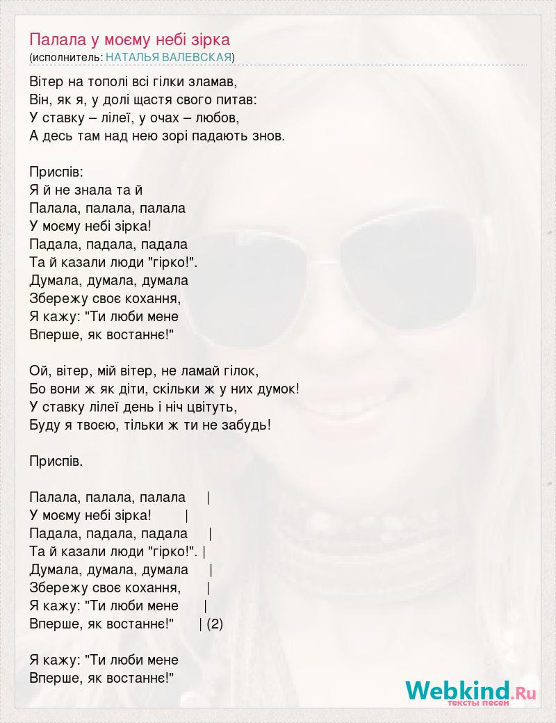 Вітер на тополі всі гілки зламав, Він, як я, у долі щастя свого питав: У ставку – лілеї, у очах – любов, А десь там над нею зорі падають знов. Приспів: Я й не знала та й Палала, палала, палала У моєму небі зірка! Падала, падала, падала Та й казали люди "гірко!". Думала, думала, думала Збережу своє кохання, Я кажу: "Ти люби мене Вперше, як востаннє!" Ой, вітер, мій вітер, не ламай гілок, Бо вони ж як діти, скільки ж у них думок! У ставку лілеї день і ніч цвітуть, Буду я твоєю, тільки ж ти не забудь! Приспів. Палала, палала, палала | У моєму небі зірка! | Падала, падала, падала | Та й казали люди "гірко!". | Думала, думала, думала | Збережу своє кохання, | Я кажу: "Ти люби мене | Вперше, як востаннє!" | (2) Я кажу: "Ти люби мене Вперше, як востаннє!"
